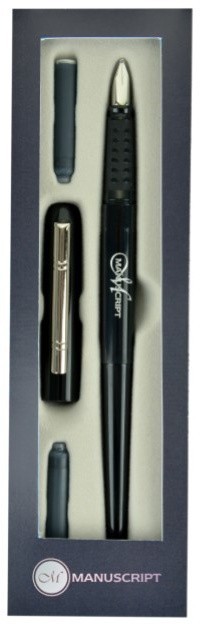 Набор Manuscript Scribe Calligraphy Pen включает в себя 1 широкое перо Scribe с серебряным покрытием для бесперебойной подачи чернил, 1 черный картридж и жестяную коробочку для хранения перьев. Такой набор прекрасно подойдет для повседневного использования начинающих и опытных каллиграфов. Основные характеристики: Перья - Scribe Nib 1.1MM, картриджи черные