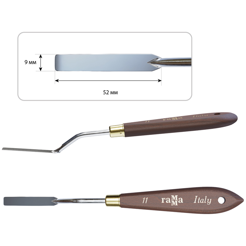 Мастихины серии «Старый Мастер» изготовлены вручную в Италии. Лезвие из нержавеющей стали прочное и упругое. Лезвие имеет специальное глянцевое покрытие для долговечной службы. Эргономичная ручка из натурального бука отполирована вручную и оснащена отверстием для хранения на подвесе. Бесшовная обойма гарантирует надежное соединение лезвия и ручки. Коллекция мастихинов представлена в 12 самых популярных видах лезвий: ромб, капля, «рыбка», овальное, прямоугольные.
