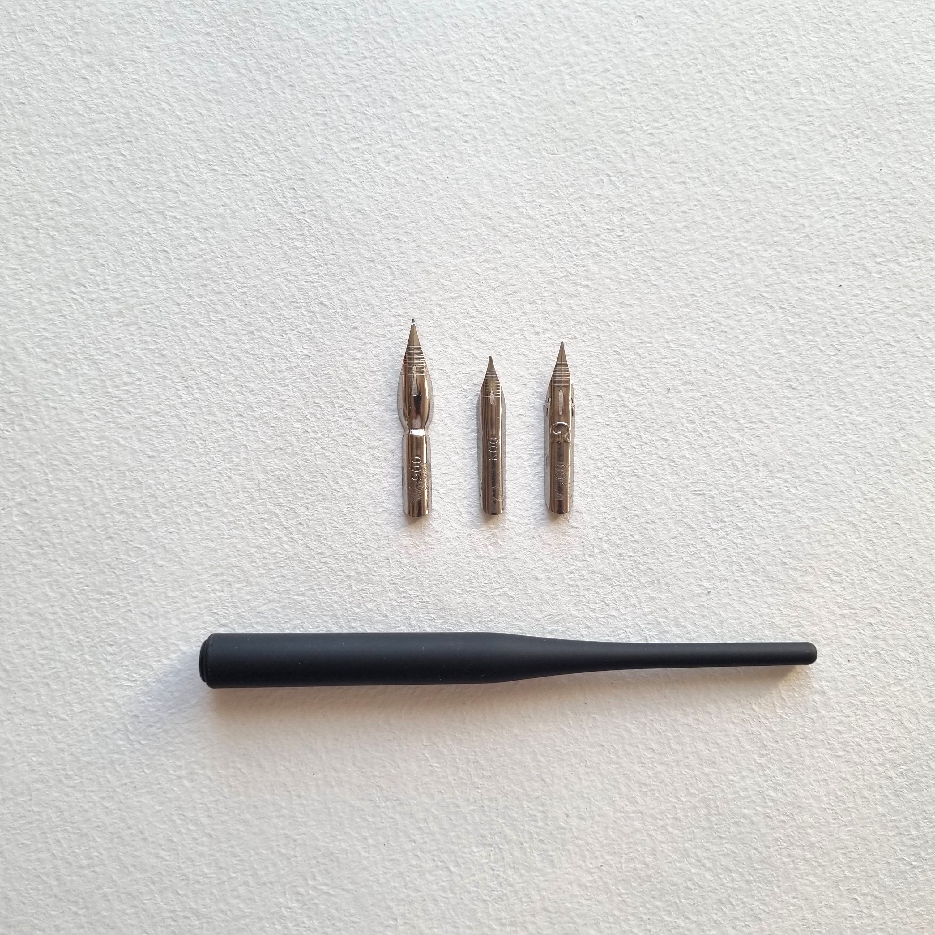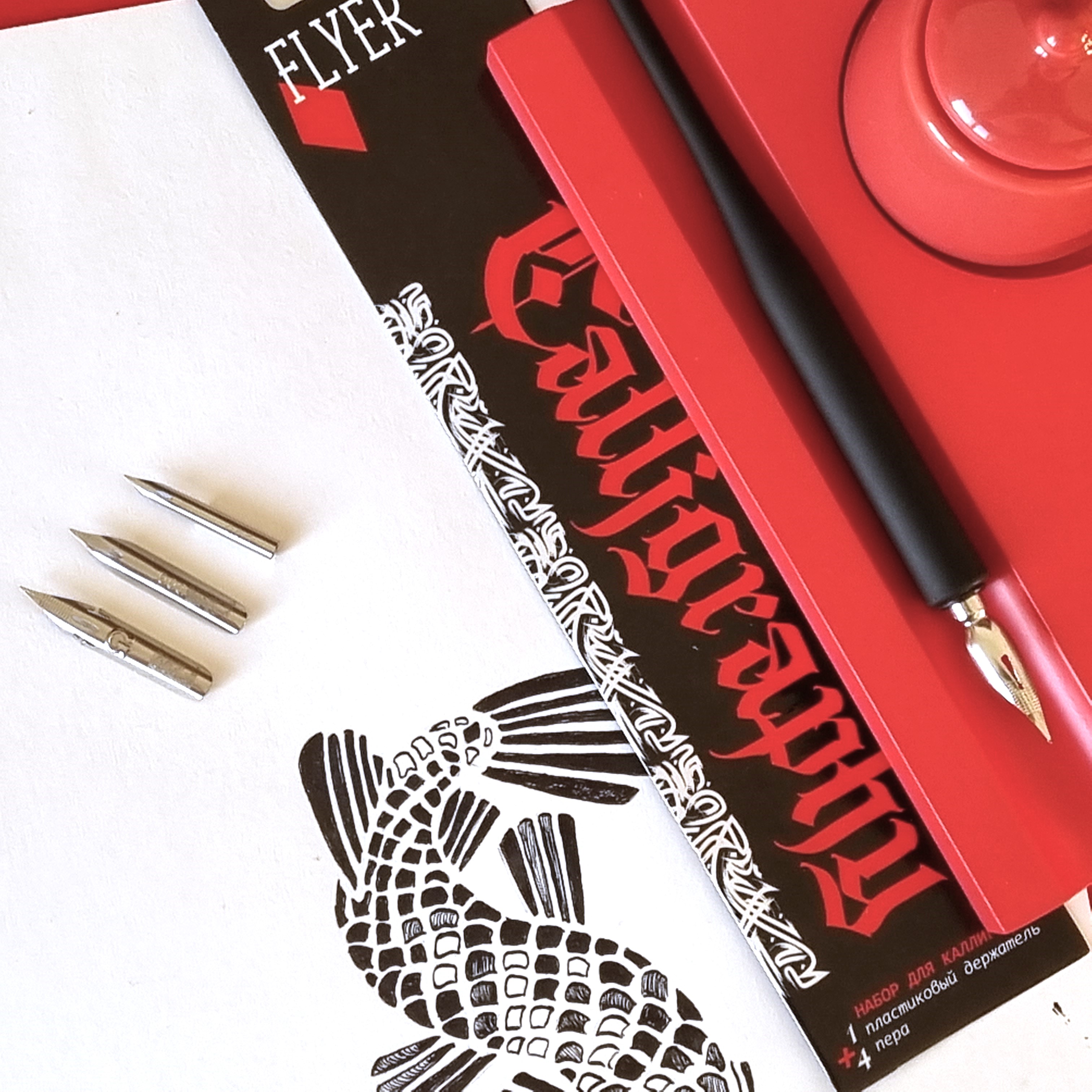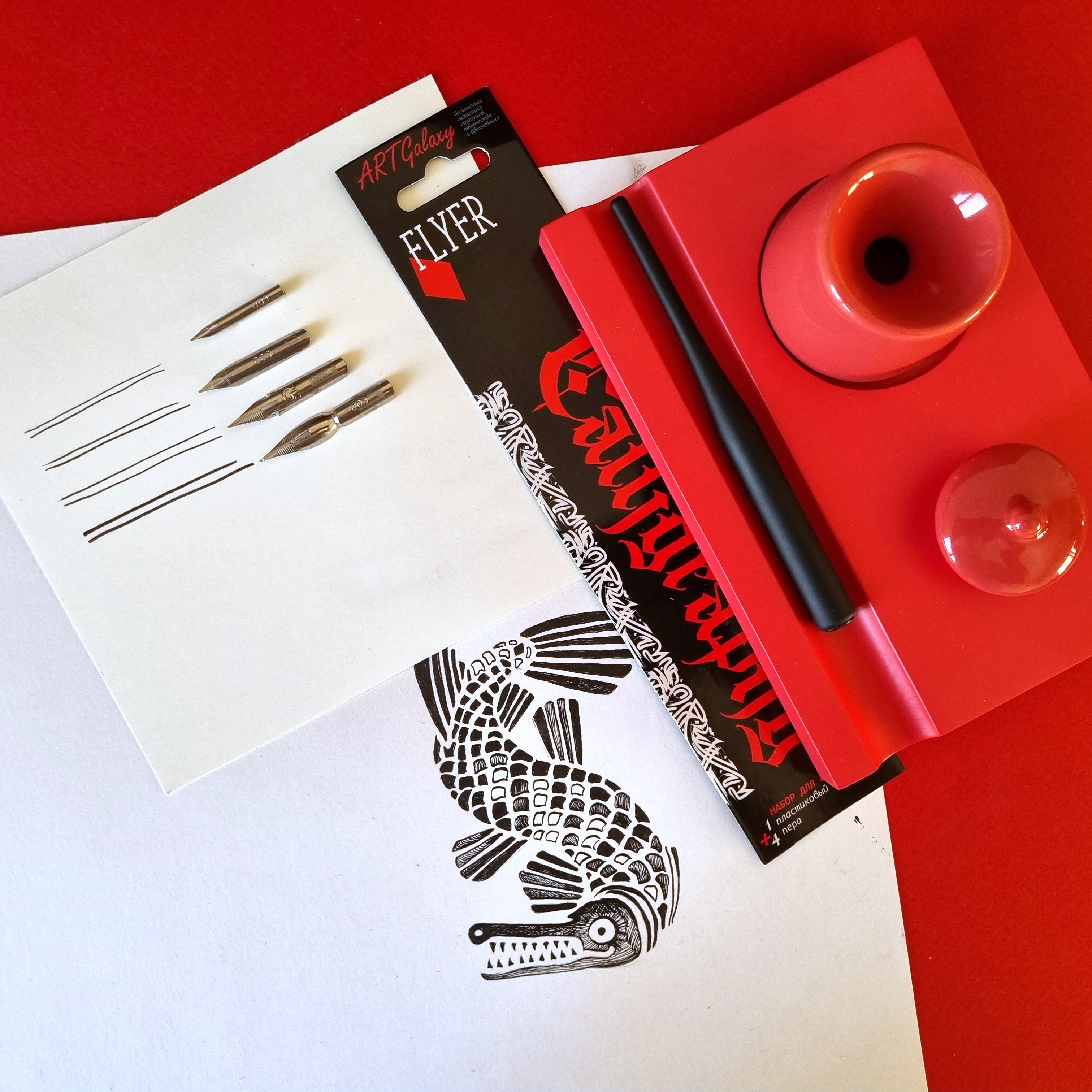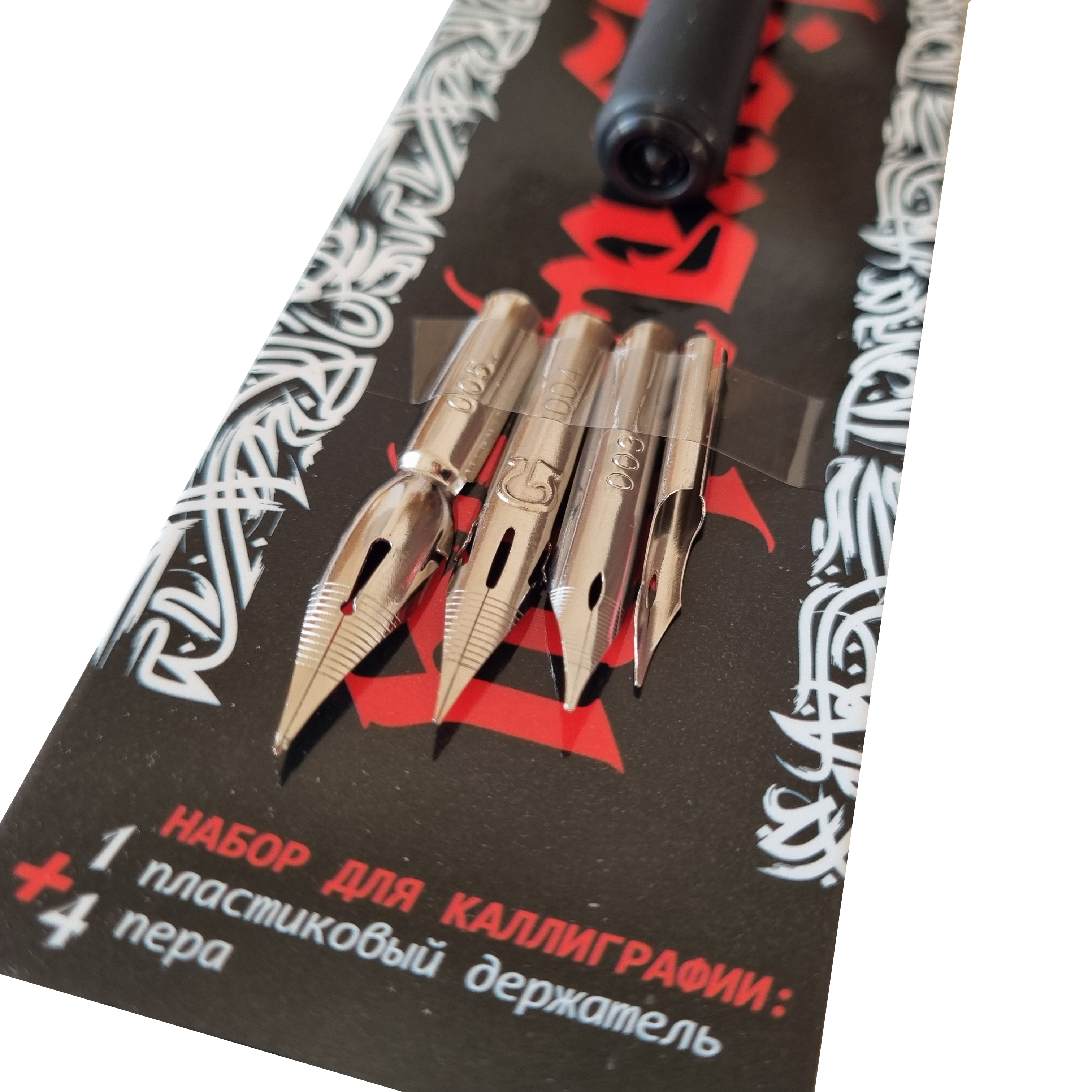 Набор для каллиграфии, 5 перьев, держатель, тушь в картонной коробке.