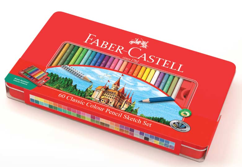 Набор цветных карандашей шестигранной формы серии «Замок» в прочной металлической коробке производителя Faber-Castell. Помимо цветных карандашей, в набор входят 2 чернографитных карандаша Grip, ластик и точилка для карандашей стандартного размера.Карандаши выполнены в шестигранном корпусе из прочного дерева. Грифель карандашей состоит из высококачественных пигментов ярких оттенков. Мягкость грифеля обеспечивает легкое скольжение и комфортное рисование на бумаге любого типа. Благодаря специальной технологии крепления грифеля (SV), грифель не ломается при падении и затачивании.Отстирываются с большинства тканей.