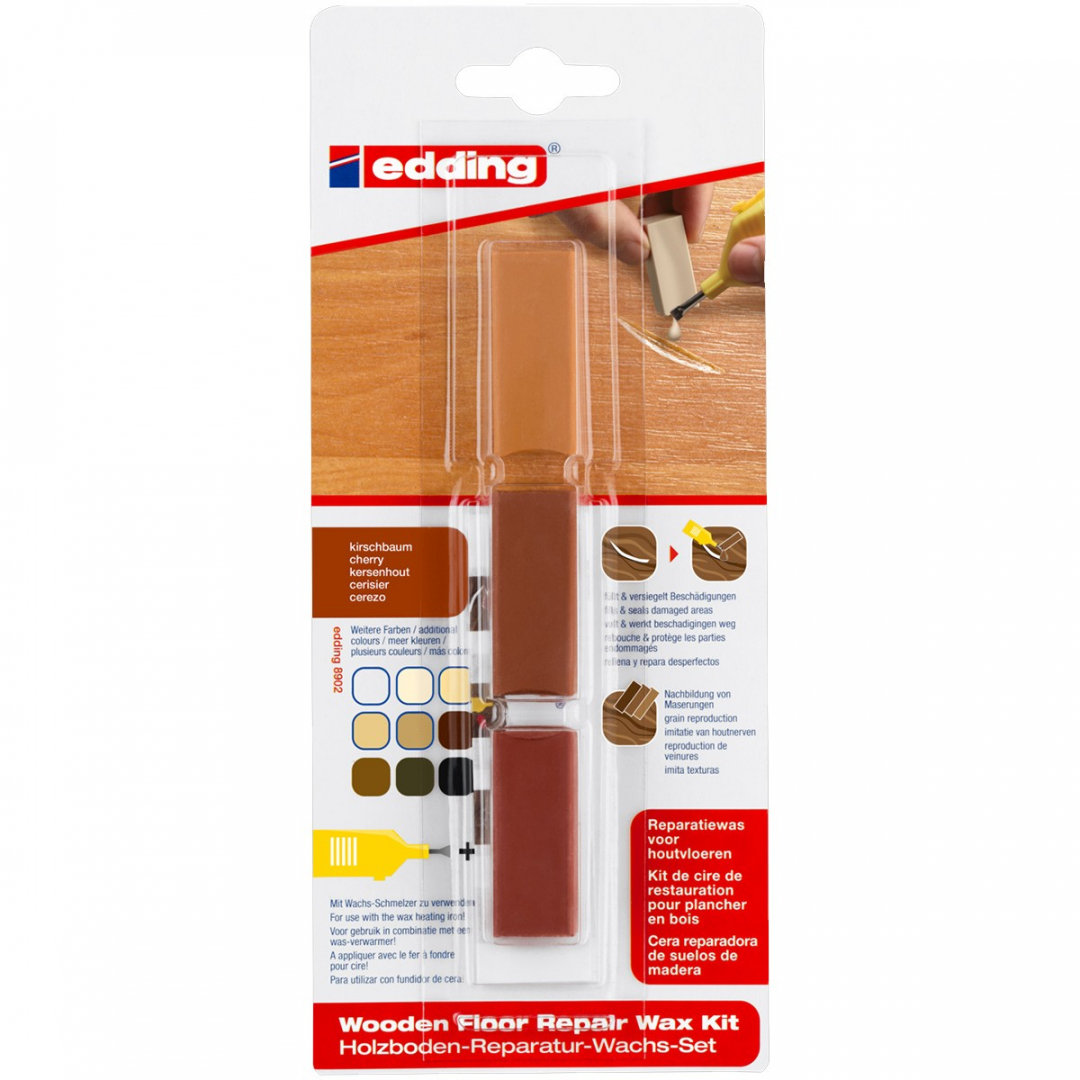 Воск для реставрации мебели Edding "8901", "8902" применяется для ремонта глубоких повреждений на деревянных, мебельных поверхностях. Мебельный воск идеален для ремонта повреждений на деревянных, мебельных поверхностях. Применяются как на горизонтальной так и на вертикальной поверхности. Смешивание различных цветов восковых мелков позволяет создать однородную текстуру с поверхностью. В комплект мебельного воска входит пластмассовый шпатель, которым очень удобно распределять воск по поврежденной поверхности. Мебельный воск доступен в 10 разных цветовых комплектах, 3 цвета в упаковке. Смесь из минеральных восков, окрашенных натуральным красящим пигментом. Очень просто использовать. Цвета можно смешать. Размер воскового бруска 40,0 +/-2,0 x 14,0 x 17,0 мм. Размягчаятся при 66° C, при 74° C полное размягчение продукта