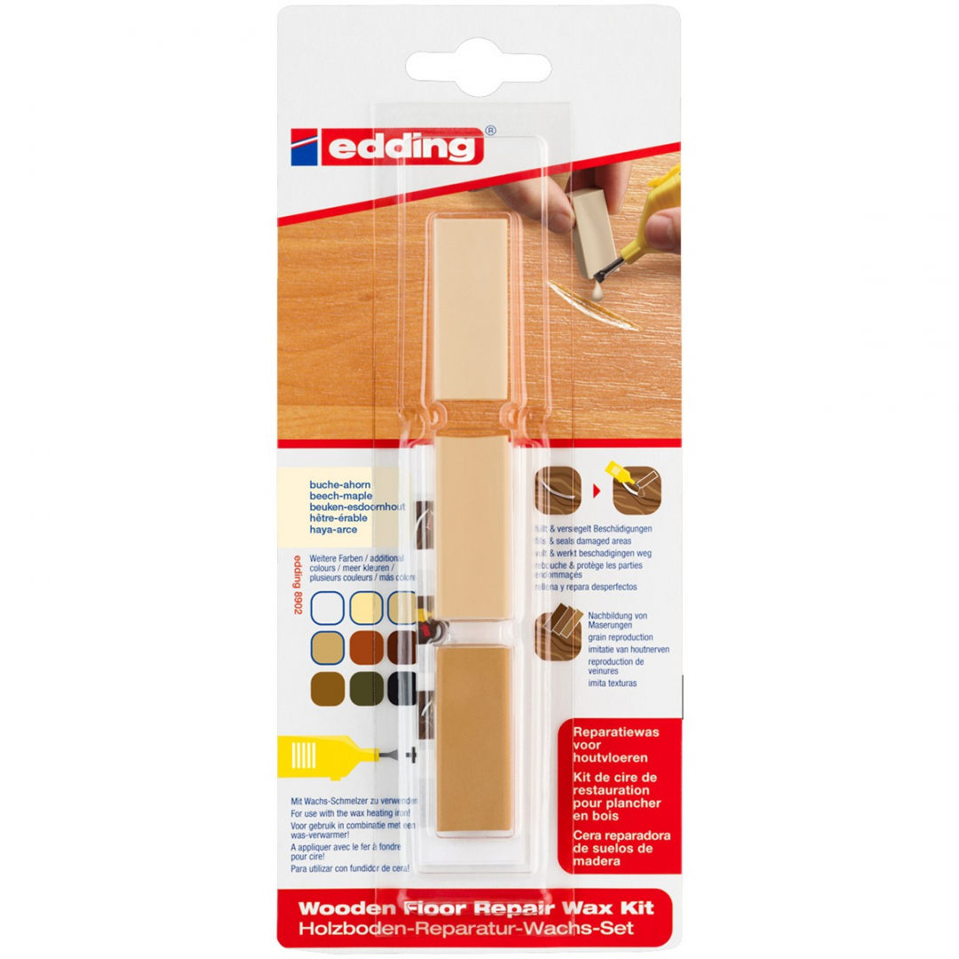 Воск для реставрации мебели Edding "8901", "8902" применяется для ремонта глубоких повреждений на деревянных, мебельных поверхностях. Мебельный воск идеален для ремонта повреждений на деревянных, мебельных поверхностях. Применяются как на горизонтальной так и на вертикальной поверхности. Смешивание различных цветов восковых мелков позволяет создать однородную текстуру с поверхностью. В комплект мебельного воска входит пластмассовый шпатель, которым очень удобно распределять воск по поврежденной поверхности. Мебельный воск доступен в 10 разных цветовых комплектах, 3 цвета в упаковке. Смесь из минеральных восков, окрашенных натуральным красящим пигментом. Очень просто использовать. Цвета можно смешать. Размер воскового бруска 40,0 +/-2,0 x 14,0 x 17,0 мм. Размягчаятся при 66° C, при 74° C полное размягчение продукта