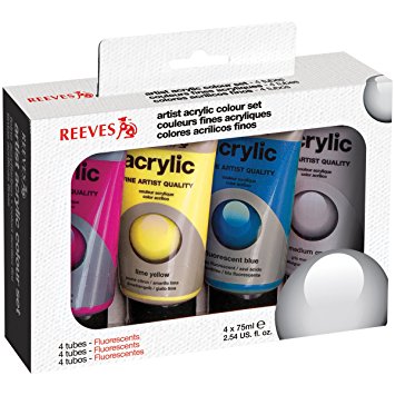Набор акриловых красок в тюбиках, 4 х 75 мл, флуоресцентные, в прозрачной пластиковой упаковке (цвета желтый, розовый, голубой, переливающийся белый)