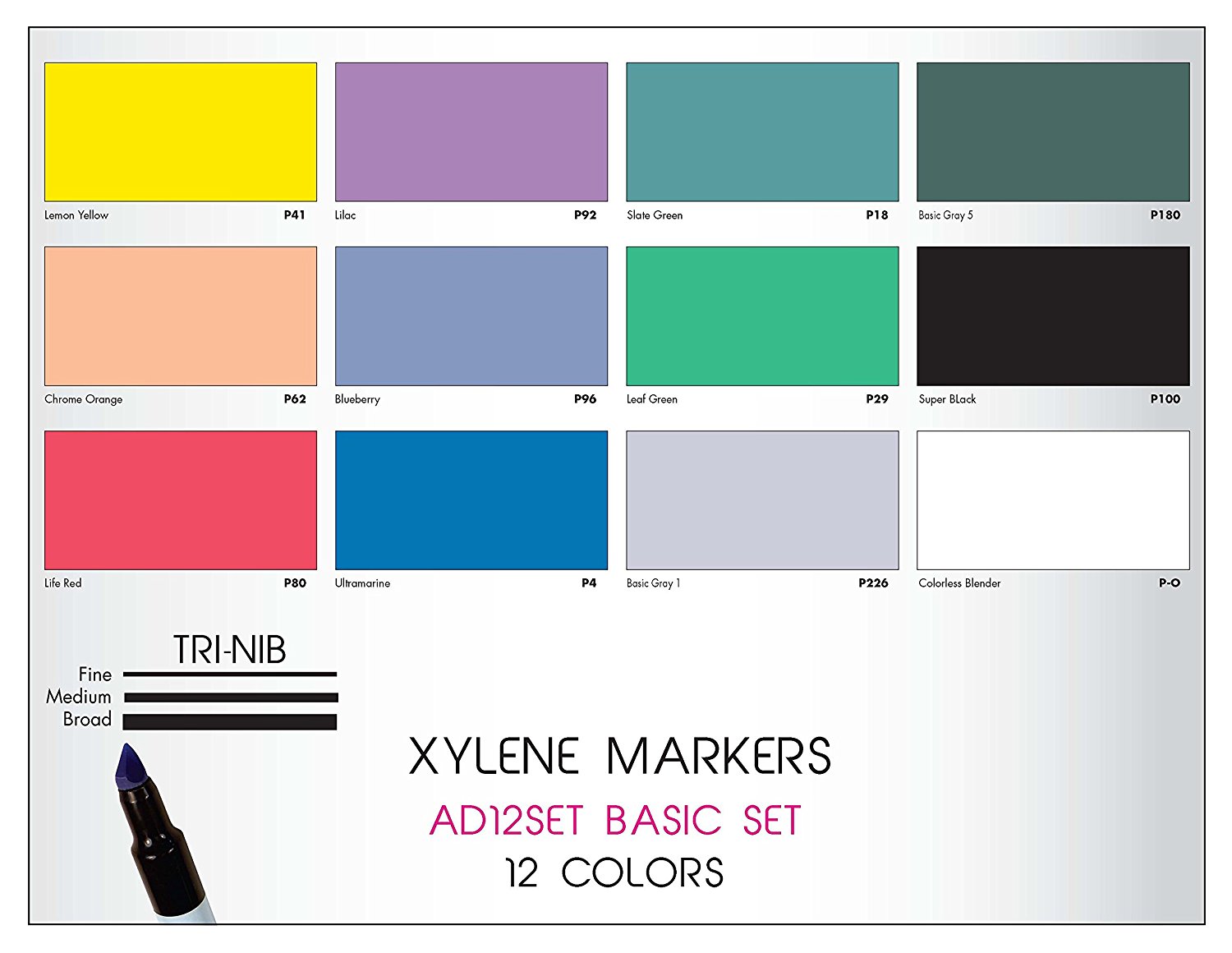 Маркеры Chartpak AD Markers отлично подойдут для дизайнеров за счет большого количества цветов, стойких чернил и удобного пера. Маркеры Chartpak AD Markers производятся в США. Перманентные чернила на основе растворителя, водостойкие. Универсальная форма пера маркера позволяет рисовать как тонкие, так широкие линии. Покрывные характеристики маркеров AD Marker более чем в 2 раза выше чем у обычных маркеров. Полная палитра цветов включает в себя 130 стойких, натуральных оттенков. У каждого цвета есть маркировка, номера цветов соответствуют номерам цветов в формате CMYK.