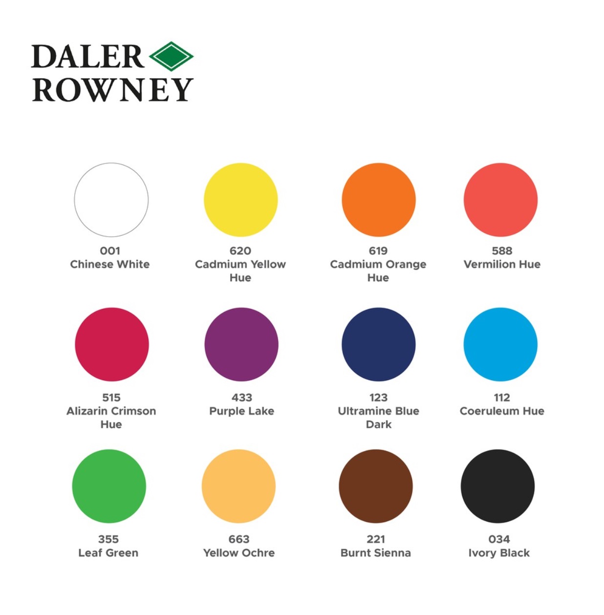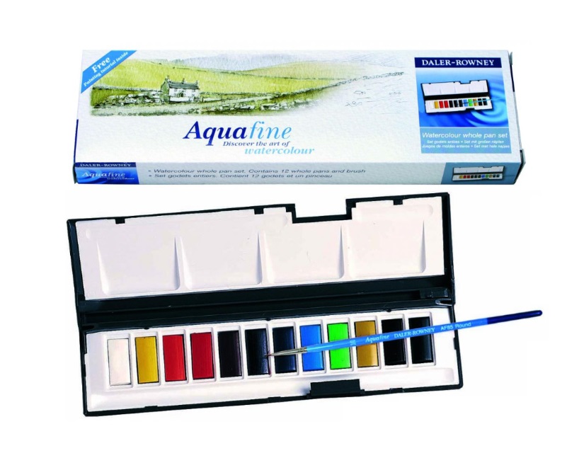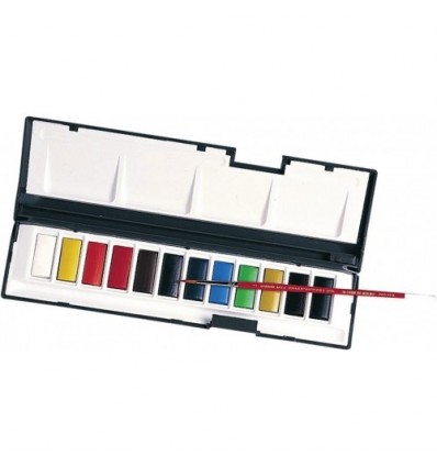 В набор 12 кювет в удобном металлическом пенале с крышкой-палитрой с кистью.