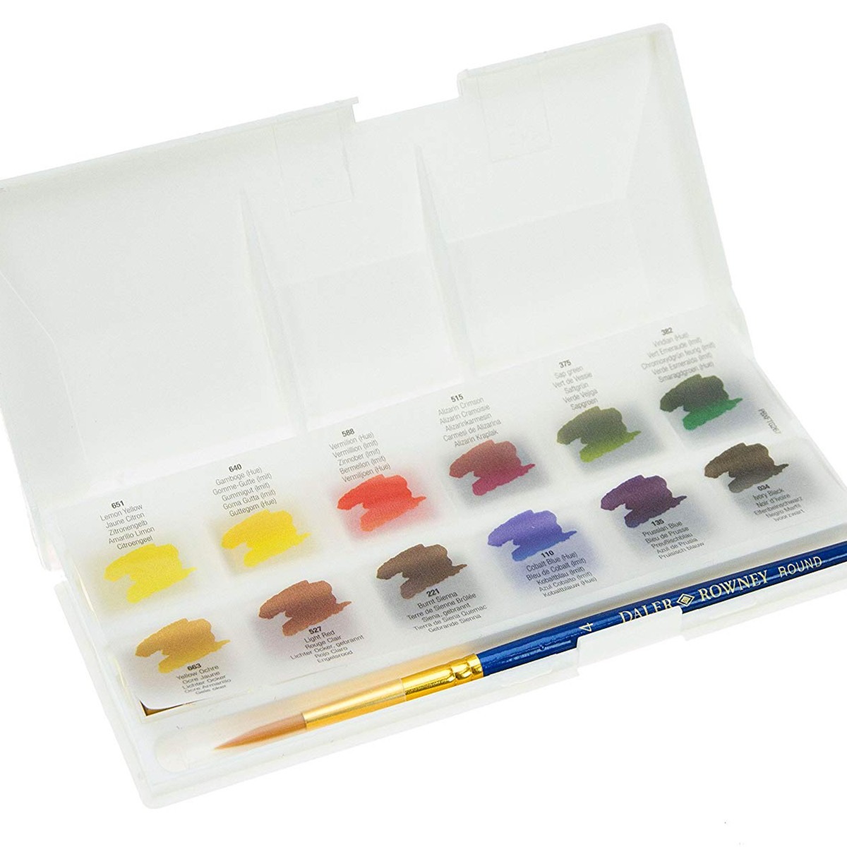 Набор акварельных красок "Simply" от "Daler-Rowney" состоит из 12 тщательно подобранных оттенков, смешивая которые можно получить все необходимые для живописи цвета. Краски помещены в удобную и прочную коробку с отделением для кисточек. Внутренние белая поверхность крышки служит палитрой, которую очень просто отмыть. В комплект входит также круглая кисть с тонким кончиком. Набор может стать прекрасным подарком начинающему художнику.