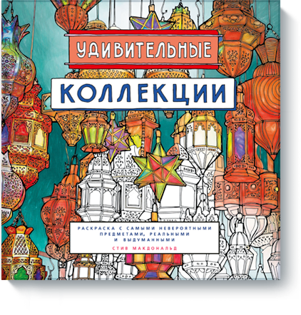 Новая раскраска художника Стива Макдональда с увлекательными многоплановыми иллюстрациями. Удивительные коллекции самых невероятных предметов и десять медитативных мандал из фрагментов рисунков.