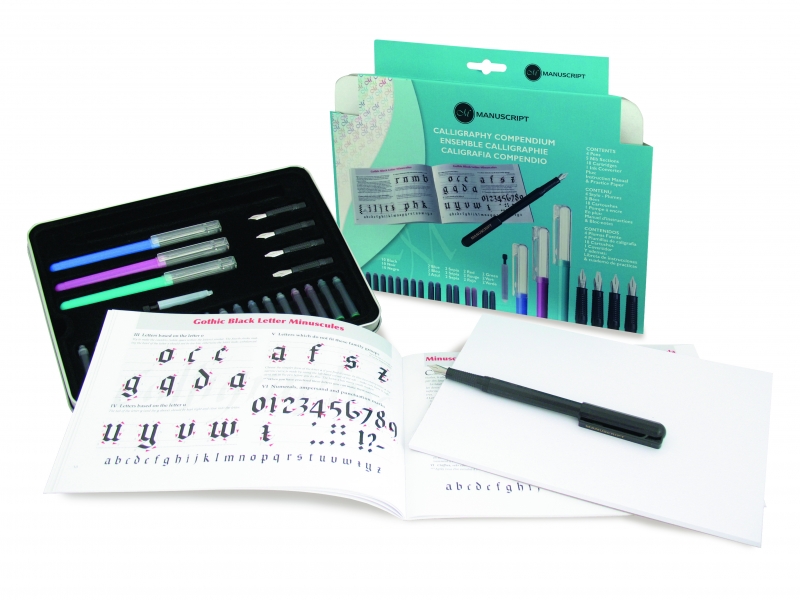 В набор входит 4 ручки для каллиграфии, 5 перьев, 18 картриджей с чернилами: черный (10 шт.), синий (2 шт.), сепия (2 шт.), красный (2 шт.), зеленый (2 шт.). Конвертер для чернил 1 шт. Также в наборе альбом для практики, инструкция и обучающий буклет.