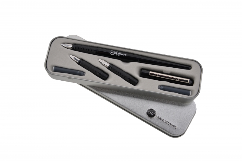 В наборе ручка для каллиграфии, 3 пишущих узла: Scribe: 1,5 мм, 2,3 мм, 2,7 мм. 2 черных картриджа в мет. Пенале