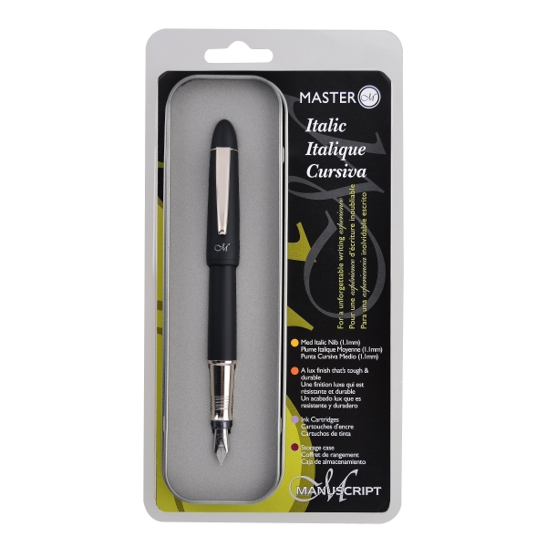 Размер кончика пера "Italic" Nib: 1,1 мм, средний (Medium). Цвет ручки: черный. Прочный корпус. В наборе картридж с черными чернилами (универсальный размер) и инструкция по применению. Складной футляр.