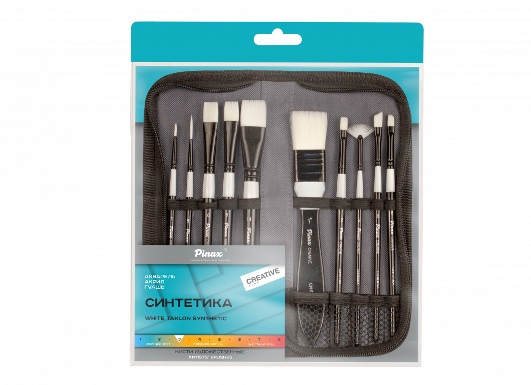 Набор из 10 кистей CREATIVE White Taklon с пучком из мягкой белой синтетики разной формы разных размеров в удобном пенале на молнии.
