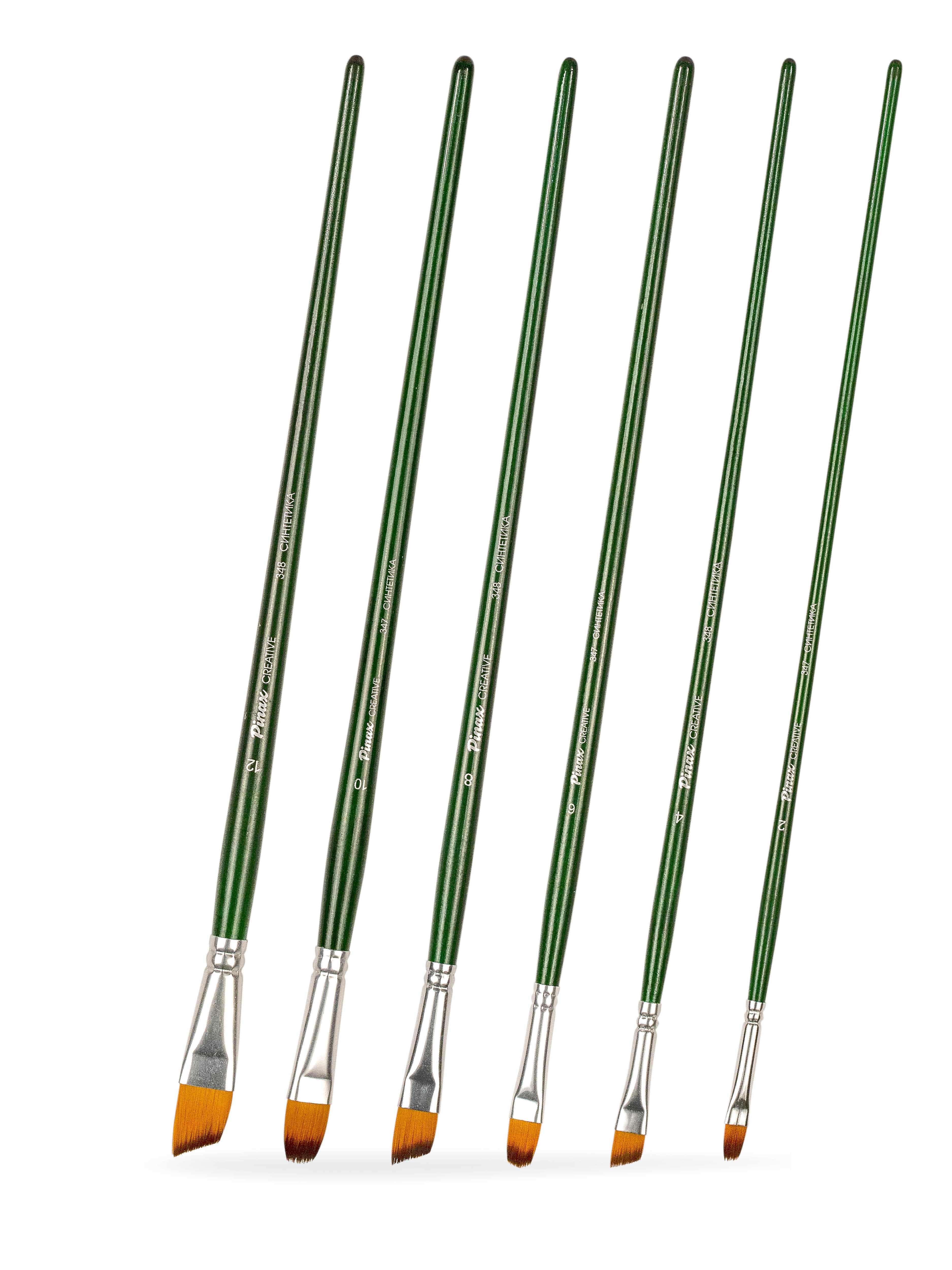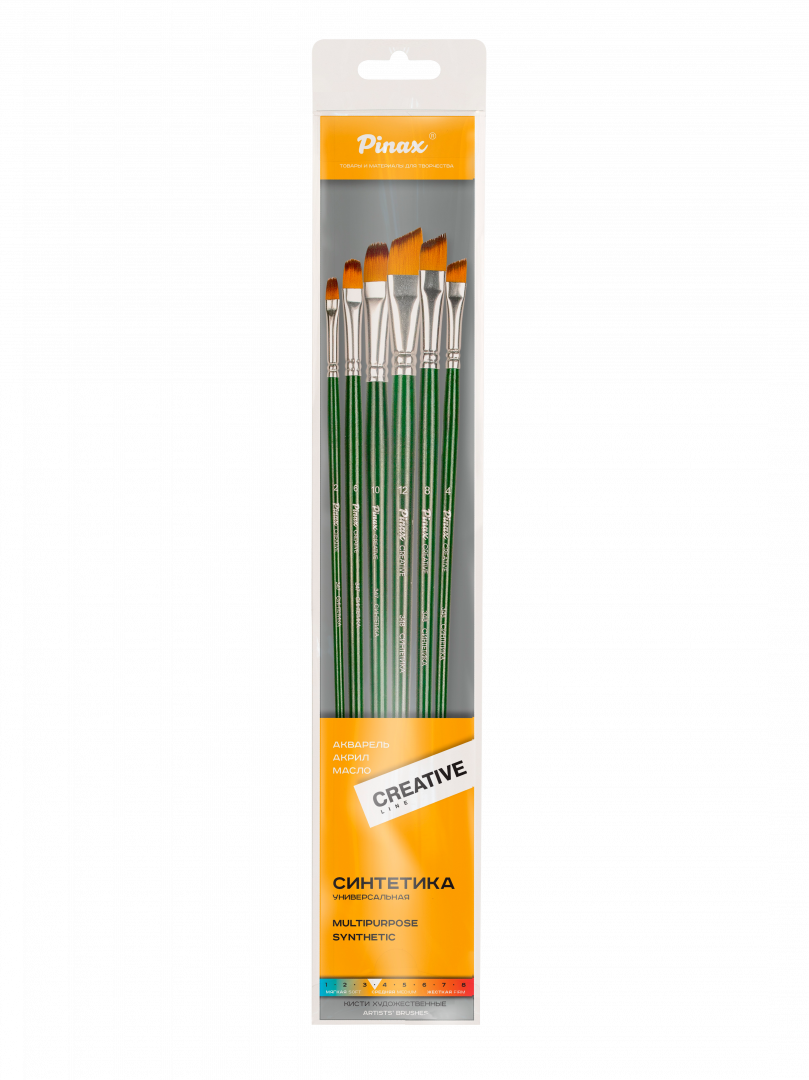 В наборе 6 кистей с пучком плоской и скошенной формой разных размеров.