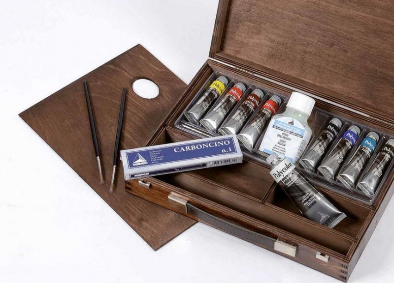 Classico Набор Масл.красок в деревянном кейсе 20х30см +Аксессуары 8 туб 20 мл. в классическом цветовом ассортименте 1 туба 60 мл. Титановые белила 1 флакон 75 мл. льняное масло. Акссесуары: кисти, палитра, уголь