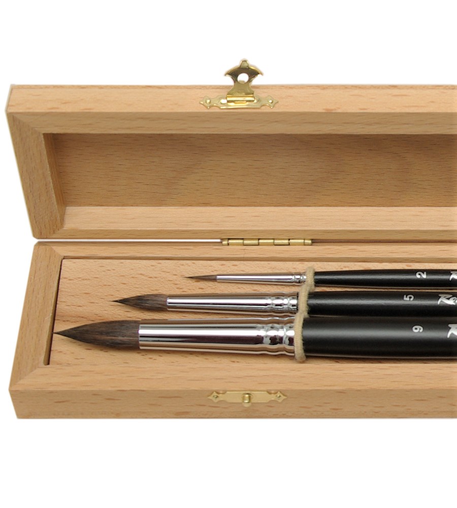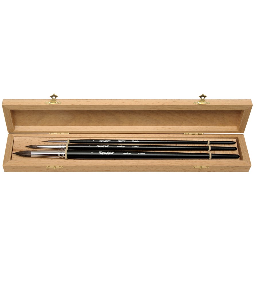 Набор №7. Три круглые кисти из волоса белки на длинной ручке № 2, 5, 9, в буковой шкатулке