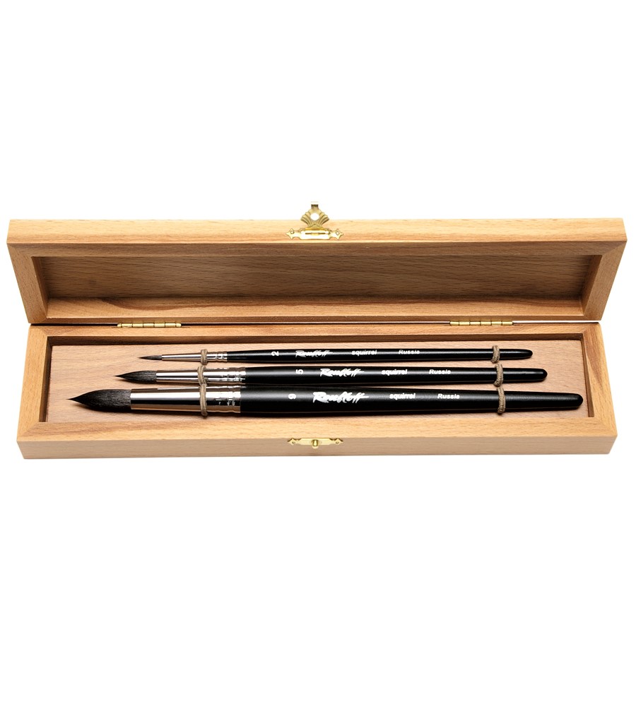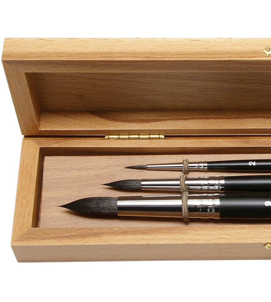 Набор №5. Три круглые кисти из волоса белки на короткой ручке № 2, 5, 9, в буковой шкатулке