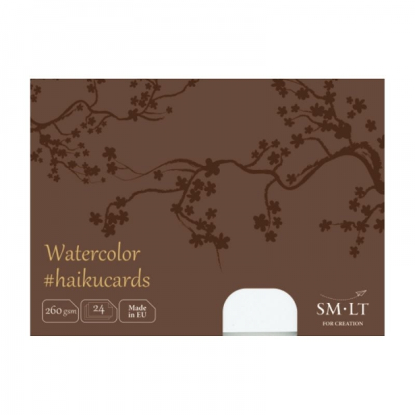 Набор открыток "Watercolor" #haikucards из белой мелкозернистой бумаги холодного прессования с добавлением хлопка плотностью 260 г/м2 для акварели. 24 открытки со скругленными краями упакованы в плотный конверт из темно-коричневого картона.