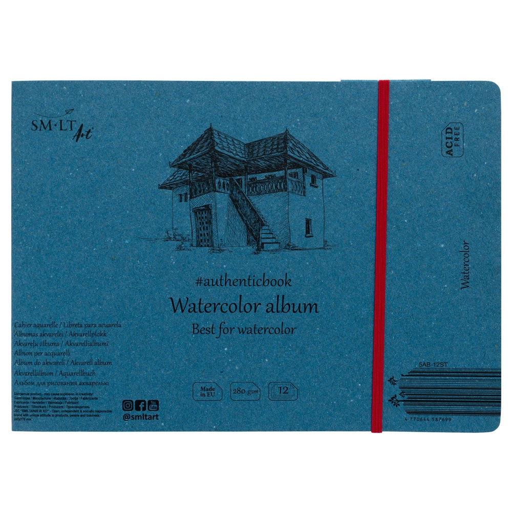 Скетчбук для акварели "Watercolor" с белой крупнозернистой бумагой плотностью 280 г/м2. Синяя картонная обложка, закладка на красной резинке, внутри 12 листов. Тип крепления: сшивка по короткой стороне. Бумага не содержит кислот, сертифицирована FSC.