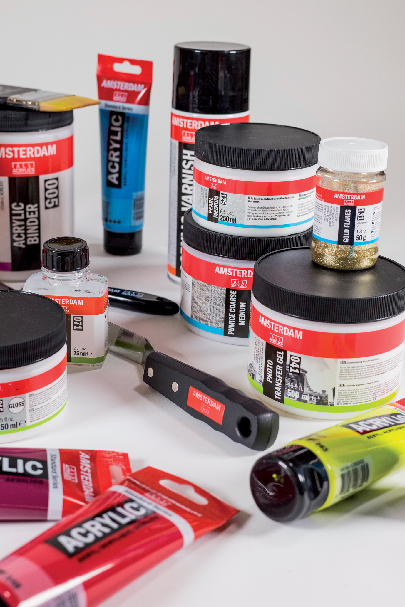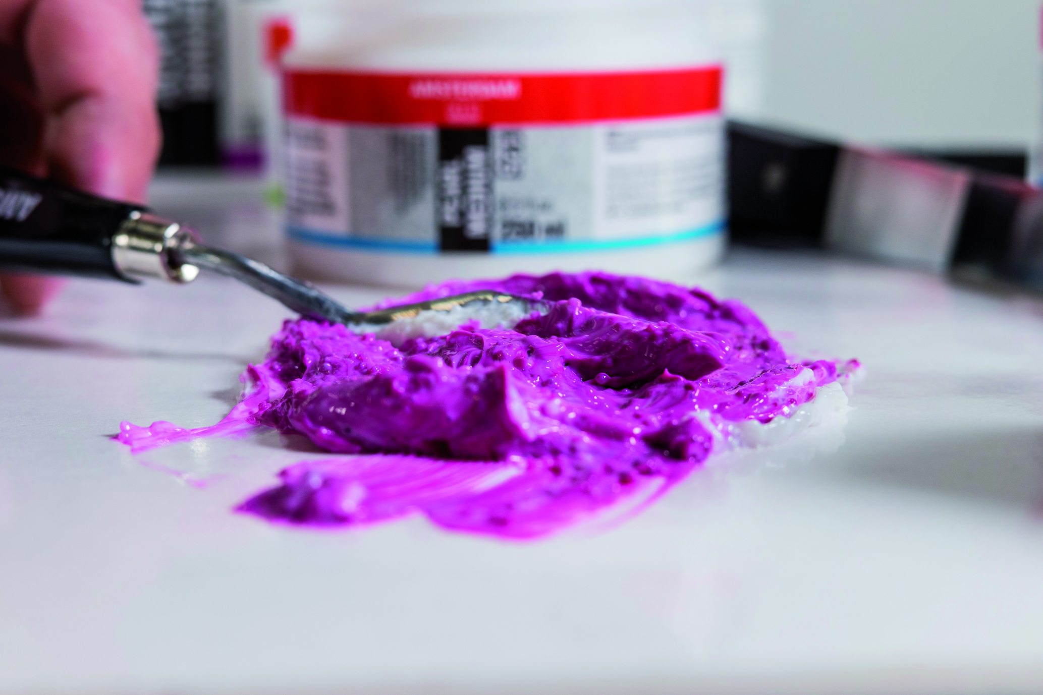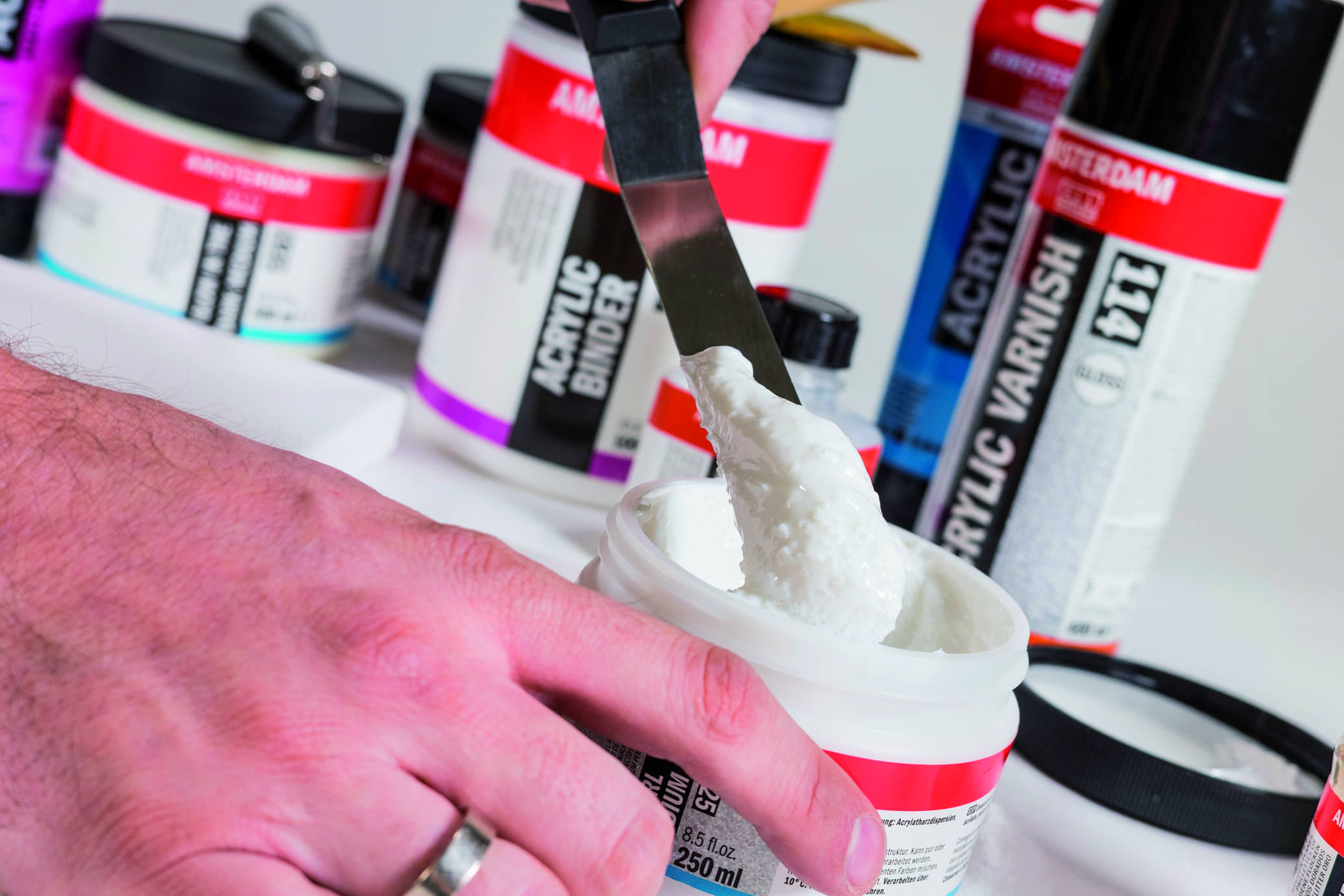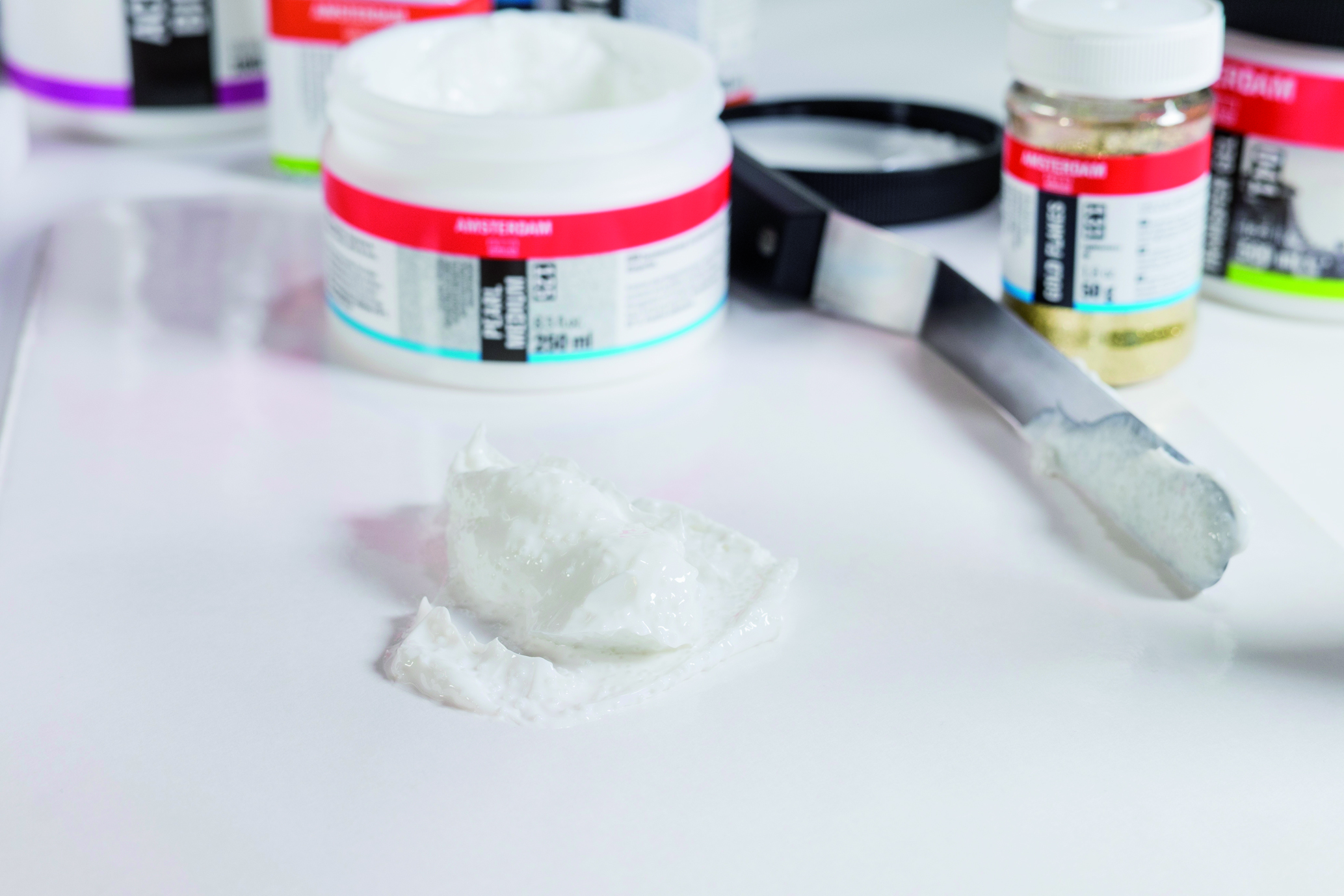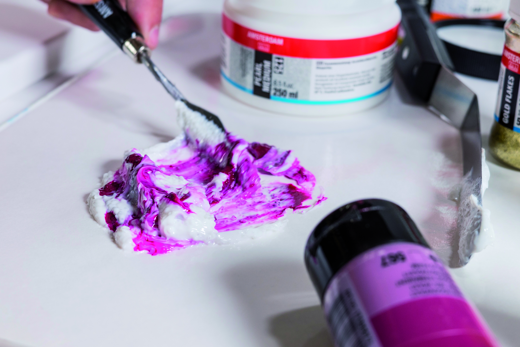 Можно наносить как самостоятельно, так и в смеси с акриловыми красками. Максимальный эффект достигается в смесях с прозрачными акриловыми красками.