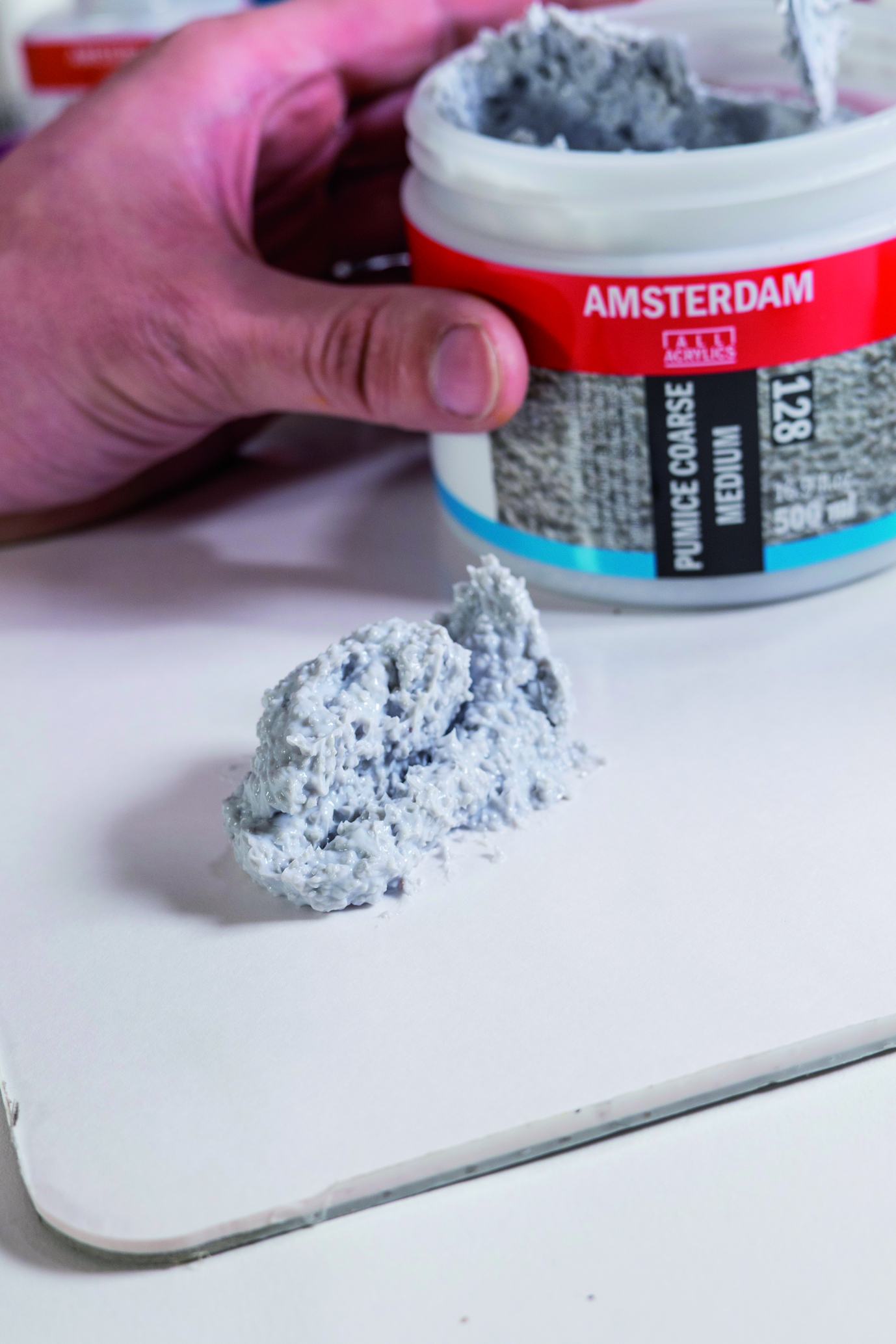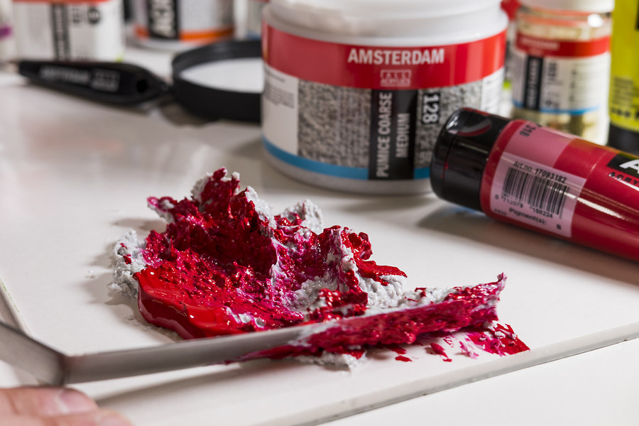 Можно наносить как самостоятельно (пемза имеет натуральный серый оттенок), так и в смеси с акриловыми красками. Также паста прекрасно ложится на уже сформированный красочный слой, что удобно при работе с быстросохнущими красками.
