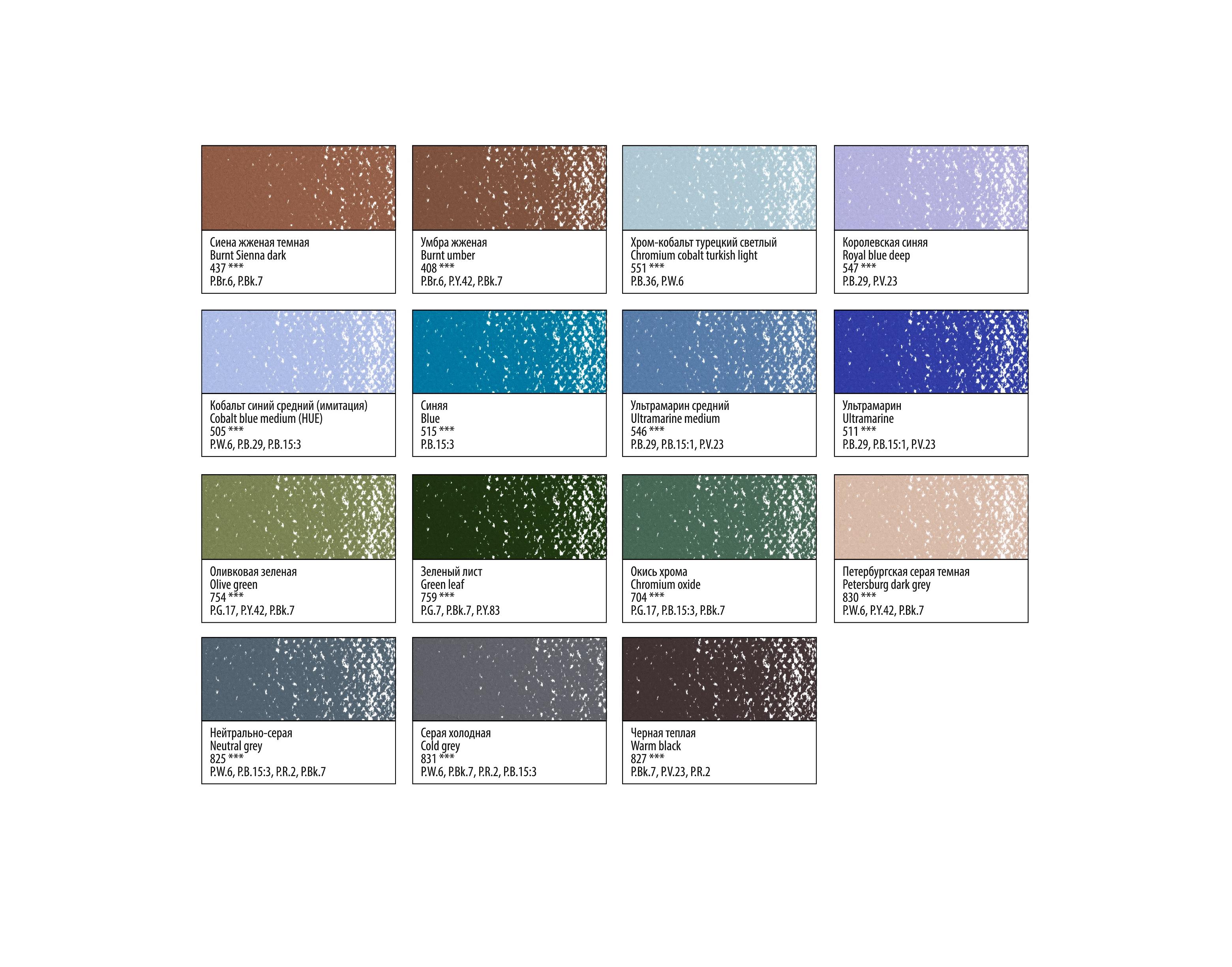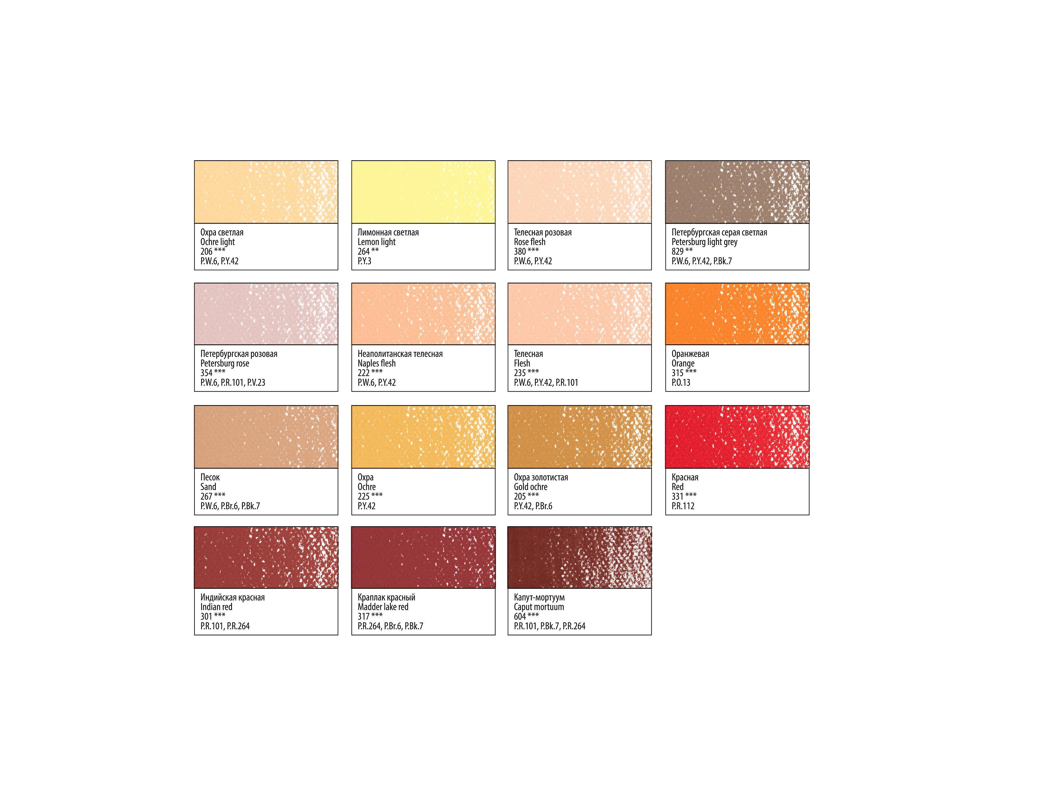 Охра светлая (206) | Лимонная светлая (264) | Телесная розовая (380) | Петербургская серая светлая (829) | Петербургская розовая (354) | Телесная (235) | Оранжевая (315) | Неаполитанская телесная (222) | Песок (267) | Охра (225) | Охра золотистая (205) | Петербургская серая темная (830) | Красная (331) | Индийская красная (301) | Краплак красный (317) | Капут-мортуум (604) | Сиена жженая темная (437) | Умбра жженая (408) | Хром-кобальт турецкий светлый (551) | Королевская синяя (547) | Кобальт синий средний (имитация) (505) | Синяя (515) | Ультрамарин средний (546) | Ультрамарин (511) | Оливковая зеленая (754) | Зеленый лист (759) | Окись хрома (704) | Нейтрально-серая (825) | Серая холодная (831) | Черная теплая (827)