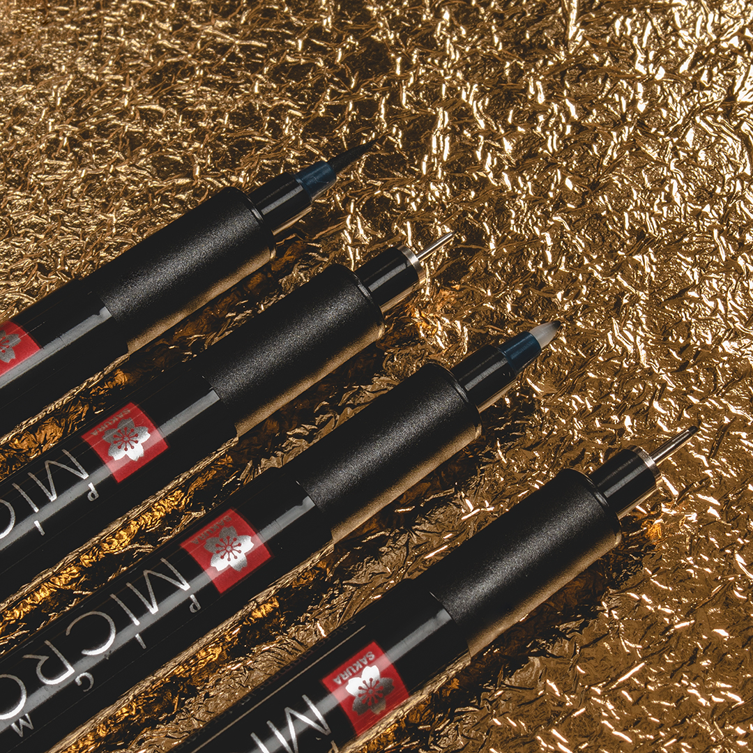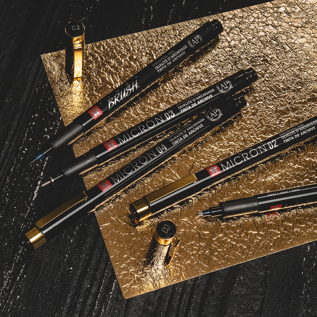 В этот набор входят 6 ручек Pigma Black & Gold Edition с наиболее популярными размерами наконечников: 005 (0,2 мм), 01 (0,25 мм), 02 (0,30 мм),03 (0,35 мм), 05 (0,45 мм), 08 (0,50 мм).Цвет чернил черный.