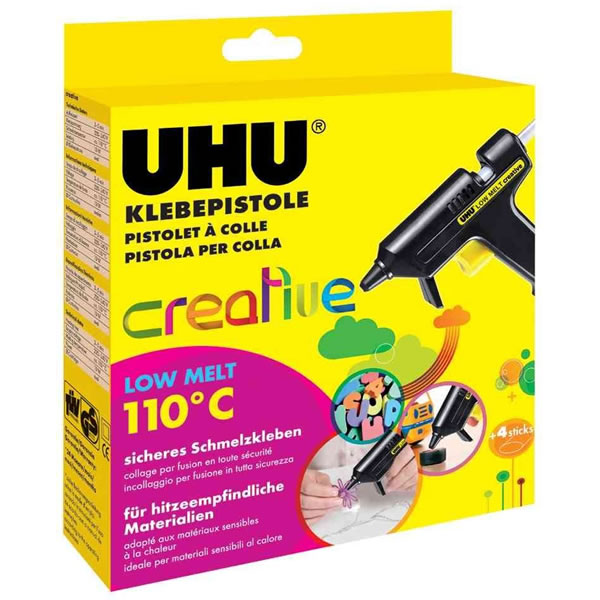 Клеевой пистолет, склеивает большинство материалов, быстро нагревается, удобно умещается в руке, является более безопасным благодаря сниженной рабочей температуре и более универсальным, чем стандартные клеевые пистолеты.