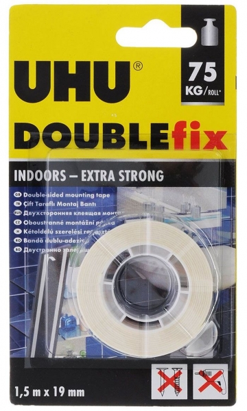 Двухсторонняя клеящая лента (скотч) подходит для фиксирования большинства материалов, такмх как металл, дерево, стекло. Пластик, керамака, резина. Размер ленты 1,5м *19мм.