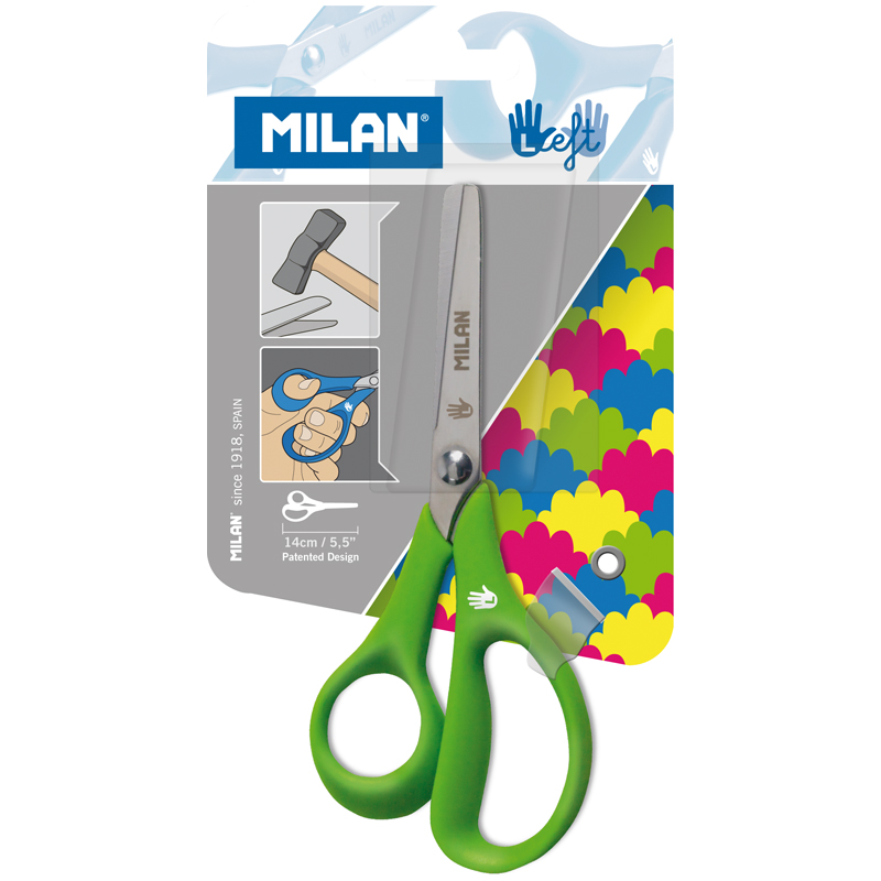 Леворукие ножницы с закругленным концом и лезвием из нержавеющей стали. Противоударная пластмассовая ручка. Идеально подходит для использования в школе.