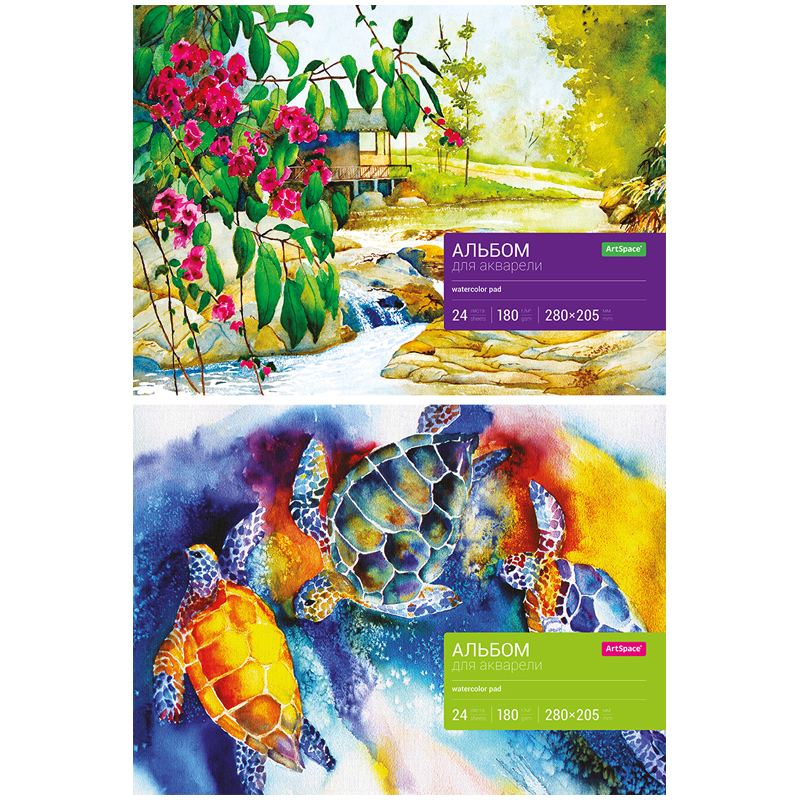 Альбом-планшет для рисования акварелью на склейке. Специальная бумага не деформируется при смачивании. Внутренний блок - рисовальная бумага марки "А" плотностью 180 г/м2. Формат альбома 280*205 мм. Обложка - мелованный картон. Жесткая подложка позволяет использовать альбом на весу.