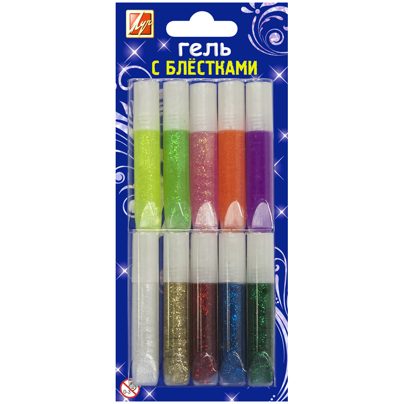 Набор 10 цв. по 5мл.:, зеленый неоновый, желтый неоновый, розовый неоновый, красный, синий, зеленый, золото, перламутровый серебряный, флуоресцентный оранжевый, флуоресцентный фиолетовый. Придает спецэффекты рисункам, открыткам, поделкам