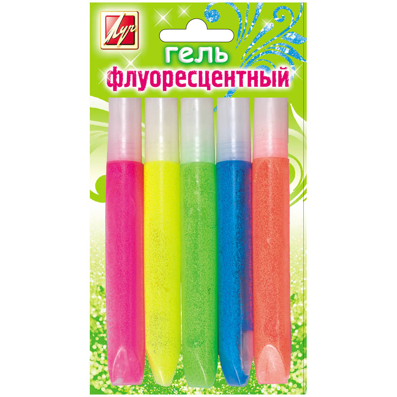 Гель флуоресцентный с блестками - это оригинальный материал для декорирования: - рисунков, - аппликаций, - поделок из гипса, глины, пластилина, - природных материалов(шишек, сухих листьев), - восковых свечей - изделий из ткани При высыхании гель дает яркий цвет, при более густом нанесении на поверхность изделия образует плотную объемную структуру. Благодаря флуоресцентным пигментам гель светится в темноте под лучами ультрафиолетовых ламп. Гель находится в удобных пластиковых тубах. Упаковка набора оснащена европодвесом. В одном саше - 10 мл.