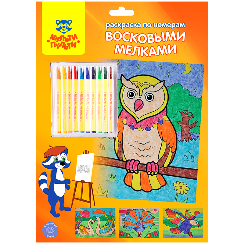 В набор входят: 10 цветных восковых мелков, 4 листа с нанесенными контурами, пронумерованными в соответствии с цветом мелка, 4 листа с нанесенным контуром без нумерации, Лист с перечнем цветов восковых мелков и образцами картинок. Для детей старше 6-ти лет.