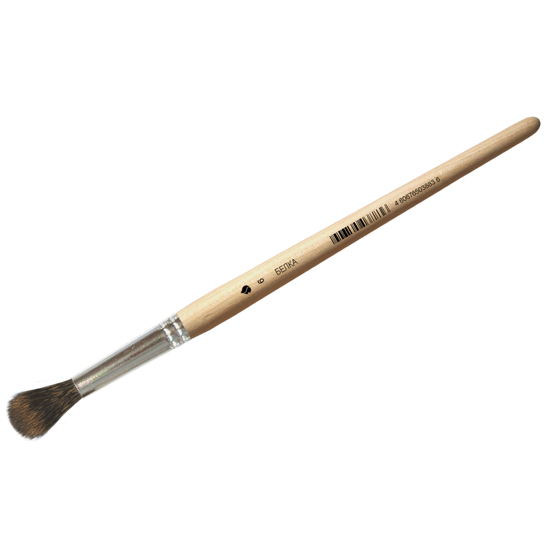 Кисть из волоса белки канадской (пестрой). Форма рабочей части: круглая. Обойма: жестяная шовная. Ручка короткая деревянная. Покрытие ручки: пропитка бесцветным лаком. Каждая кисть имеет ШК .