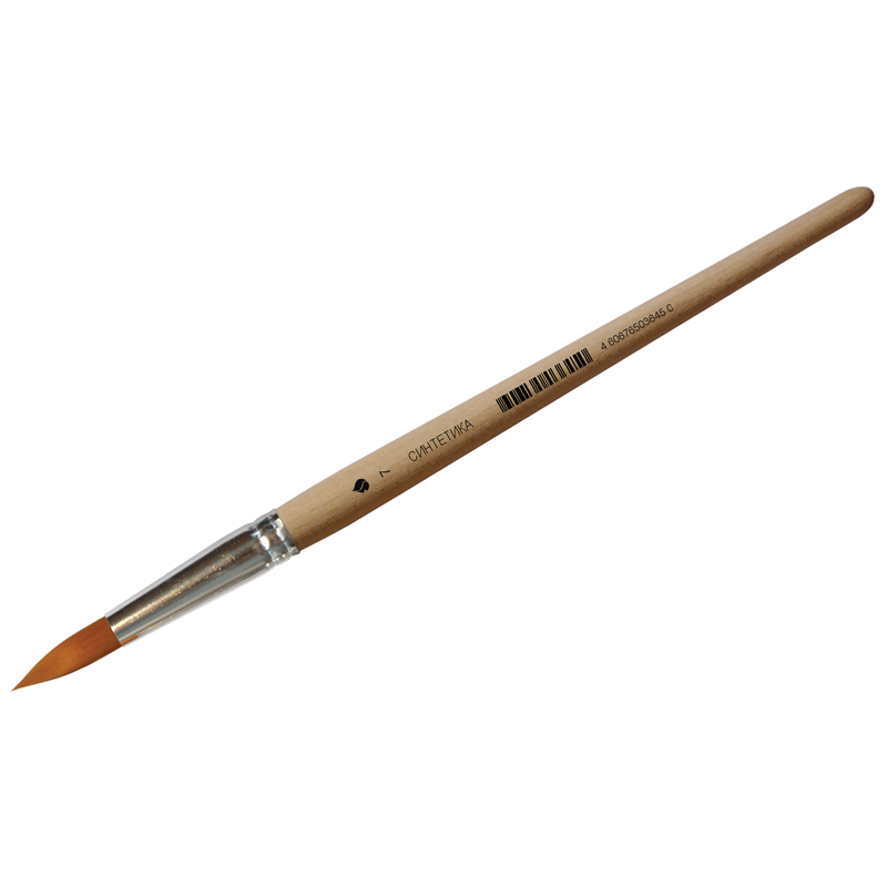 Кисть синтетическая. Форма рабочей части: круглая. Обойма: алюминий. Ручка короткая деревянная. Покрытие ручки: пропитка бесцветным лаком. Каждая кисть имеет ШК .