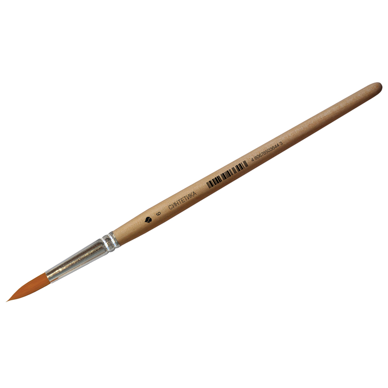 Кисть синтетическая. Форма рабочей части: круглая. Обойма: алюминий. Ручка короткая деревянная. Покрытие ручки: пропитка бесцветным лаком. Каждая кисть имеет ШК .