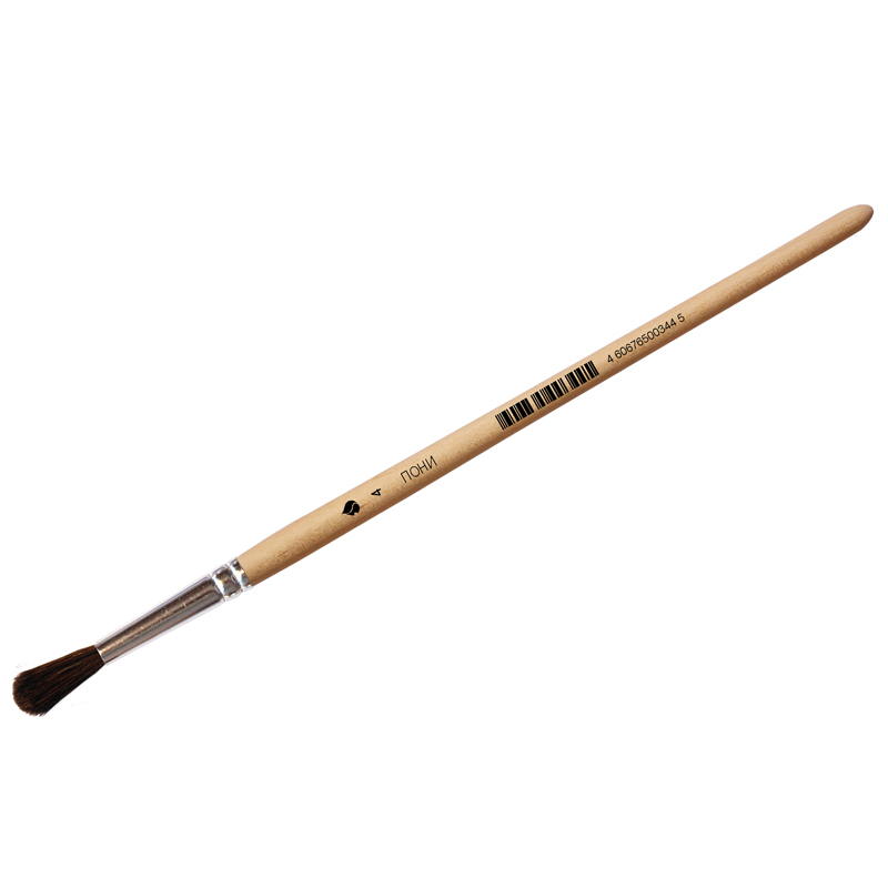 Кисть из волоса пони. Форма рабочей части: круглая. Обойма: жестяная шовная. Ручка короткая деревянная. Покрытие ручки: пропитка бесцветным лаком. Каждая кисть имеет ШК .