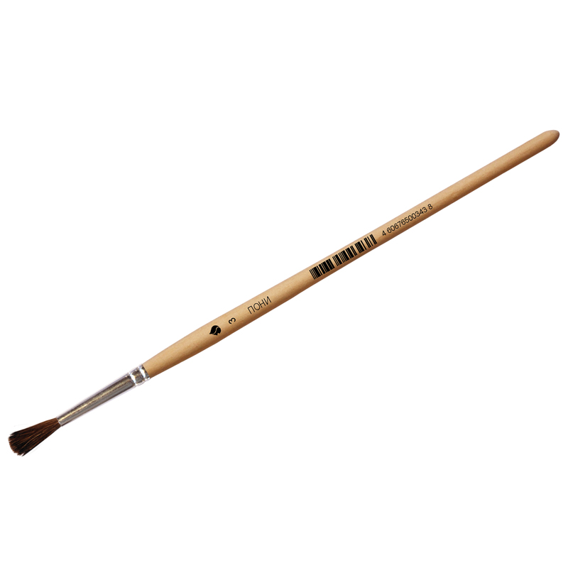Кисть из волоса пони. Форма рабочей части: круглая. Обойма: жестяная шовная. Ручка короткая деревянная. Покрытие ручки: пропитка бесцветным лаком. Каждая кисть имеет ШК .