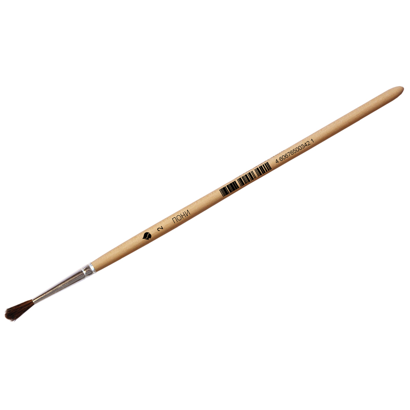 Кисть из волоса пони. Форма рабочей части: круглая. Обойма: жестяная шовная. Ручка короткая деревянная. Покрытие ручки: пропитка бесцветным лаком. Каждая кисть имеет ШК .