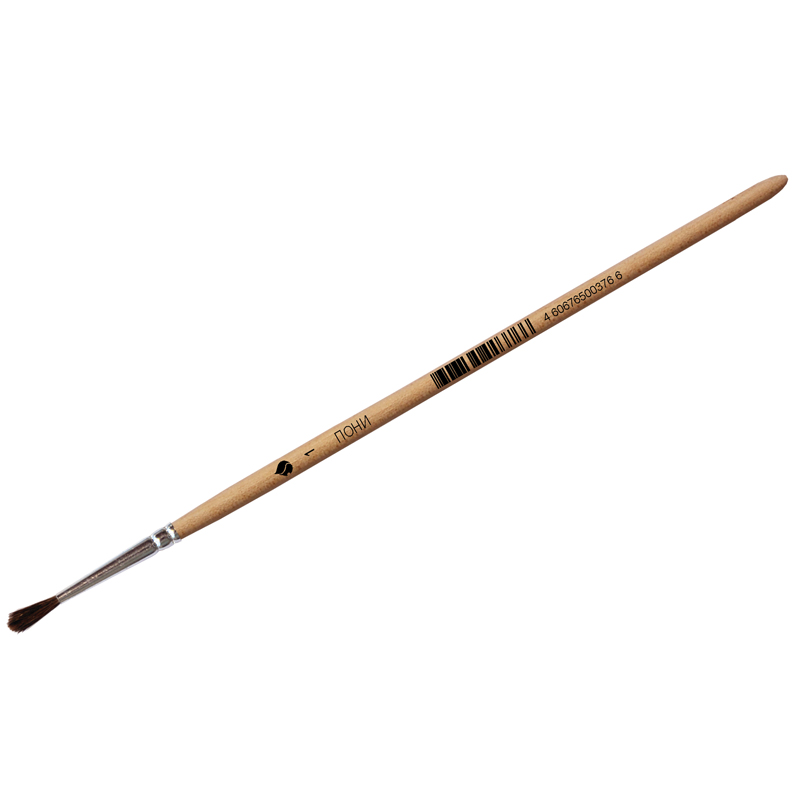 Кисть из волоса пони. Форма рабочей части: круглая. Обойма: жестяная шовная. Ручка короткая деревянная. Покрытие ручки: пропитка бесцветным лаком. Каждая кисть имеет ШК .