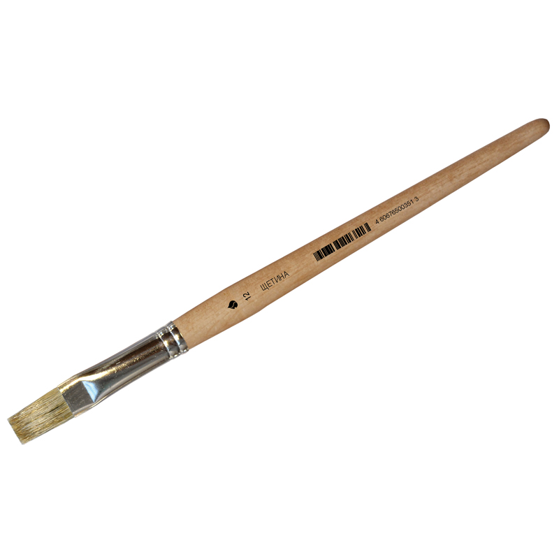 Кисть из щетины. Форма рабочей части: плоская. Обойма: жестяная шовная. Ручка короткая деревянная. Покрытие ручки: пропитка бесцветным лаком. Каждая кисть имеет ШК .