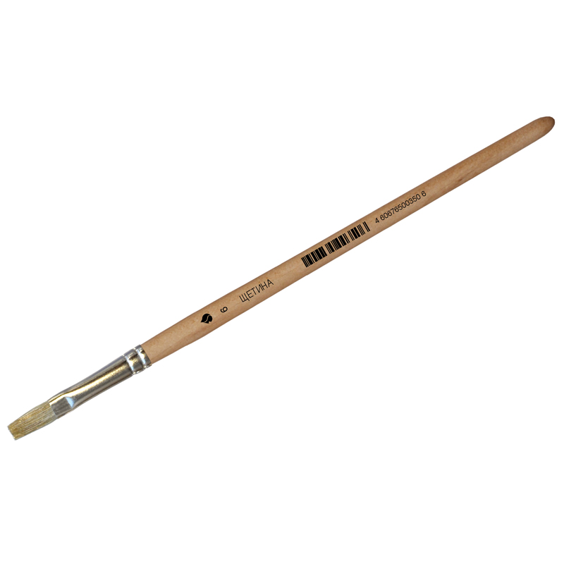 Кисть из щетины. Форма рабочей части: плоская. Обойма: жестяная шовная. Ручка короткая деревянная. Покрытие ручки: пропитка бесцветным лаком. Каждая кисть имеет ШК .