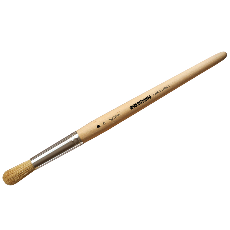 Кисть из щетины. Форма рабочей части: круглая. Обойма: жестяная шовная. Ручка короткая деревянная. Покрытие ручки: пропитка бесцветным лаком. Каждая кисть имеет ШК .