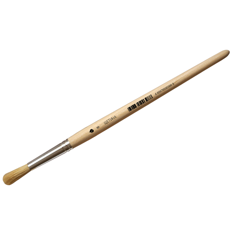 Кисть из щетины. Форма рабочей части: круглая. Обойма: жестяная шовная. Ручка короткая деревянная. Покрытие ручки: пропитка бесцветным лаком. Каждая кисть имеет ШК .
