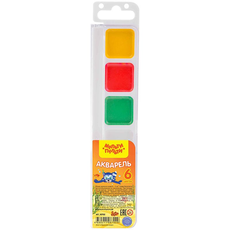 Краски Мульти-Пульти обладают хорошей укрывистостью и остаются яркими при высыхании. Смешивание акварели Мульти-Пульти дает чистые оттенки. Натуральные компоненты делают ее безопасной для здоровья детей. Пластиковая упаковка акварели удобна в использовании. Для детей старше 3-х лет.