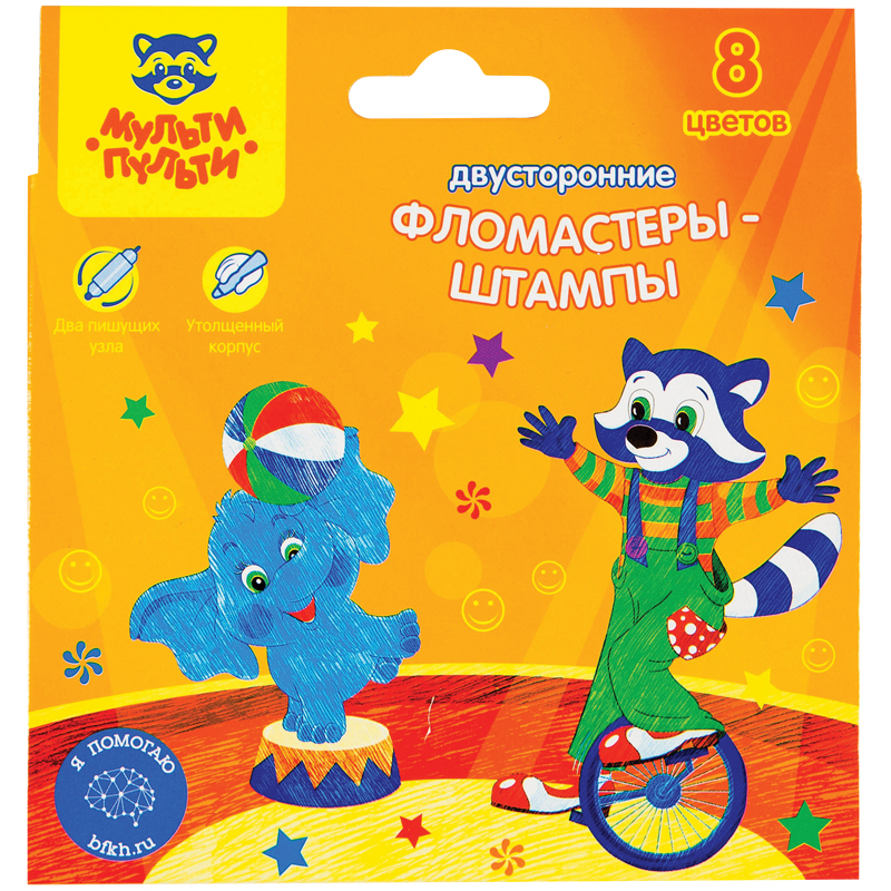 Фломастеры-штампы двустор. Мульти Пульти "Енот в цирке", 08цв., смываемые, картон