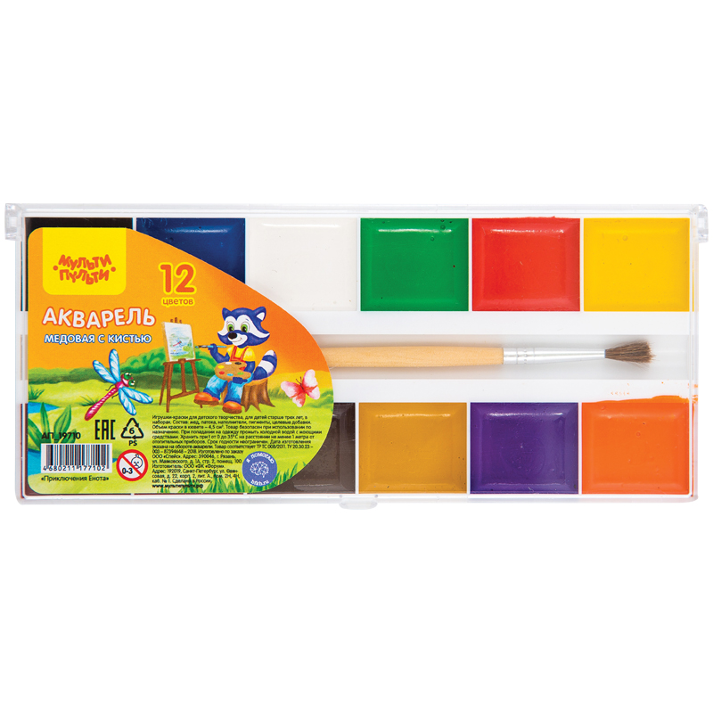 Краски Мульти-Пульти обладают хорошей укрывистостью и остаются яркими при высыхании. Смешивание акварели Мульти-Пульти дает чистые оттенки. Натуральные компоненты делают акварель безопасной для здоровья детей. Кисть в комплекте.