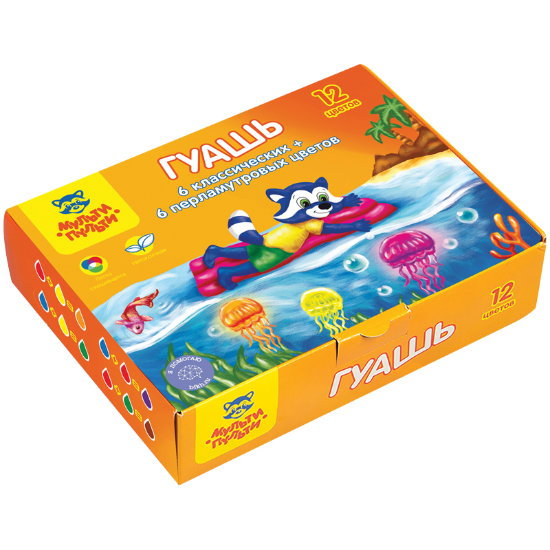 Гуашь "Приключения Енота", 12 цветов (6 классических+6 перламутровых), 20мл, картон