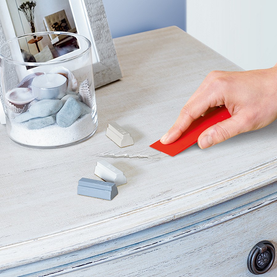 Воск для реставрации мебели Edding "8901", "8902" применяется для ремонта глубоких повреждений на деревянных, мебельных поверхностях. Мебельный воск идеален для ремонта повреждений на деревянных, мебельных поверхностях. Применяются как на горизонтальной так и на вертикальной поверхности. Смешивание различных цветов восковых мелков позволяет создать однородную текстуру с поверхностью. В комплект мебельного воска входит пластмассовый шпатель, которым очень удобно распределять воск по поврежденной поверхности. Мебельный воск доступен в 10 разных цветовых комплектах, 3 цвета в упаковке. Смесь из минеральных восков, окрашенных натуральным красящим пигментом. Очень просто использовать. Цвета можно смешать. Размер воскового бруска 40,0 +/-2,0 x 14,0 x 17,0 мм. Размягчаятся при 66° C, при 74° C полное размягчение продукта