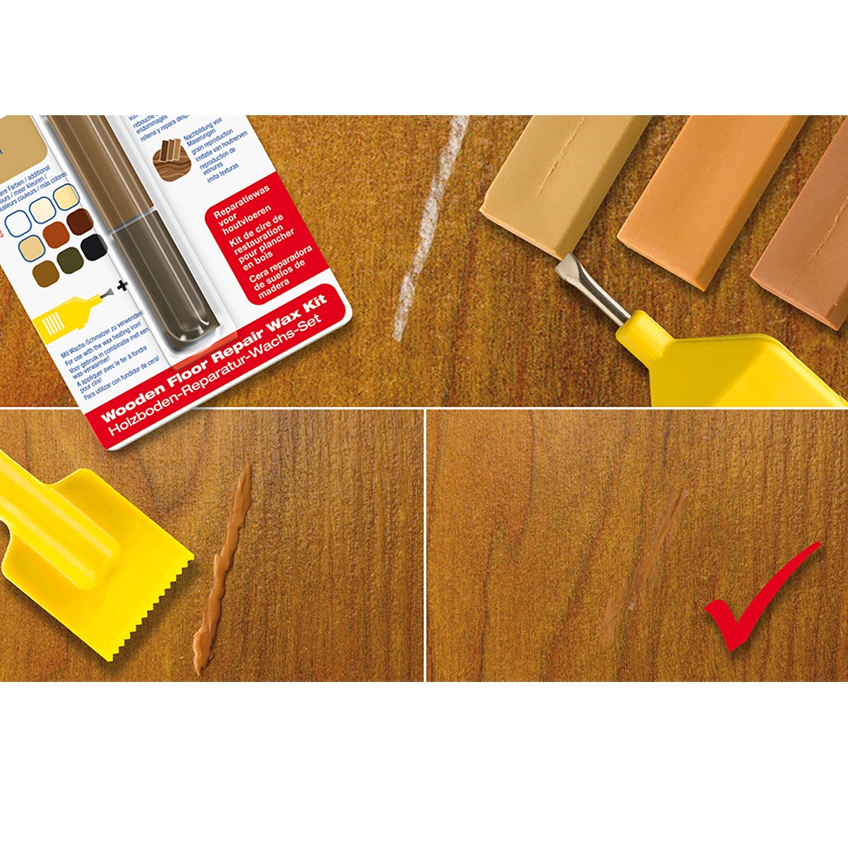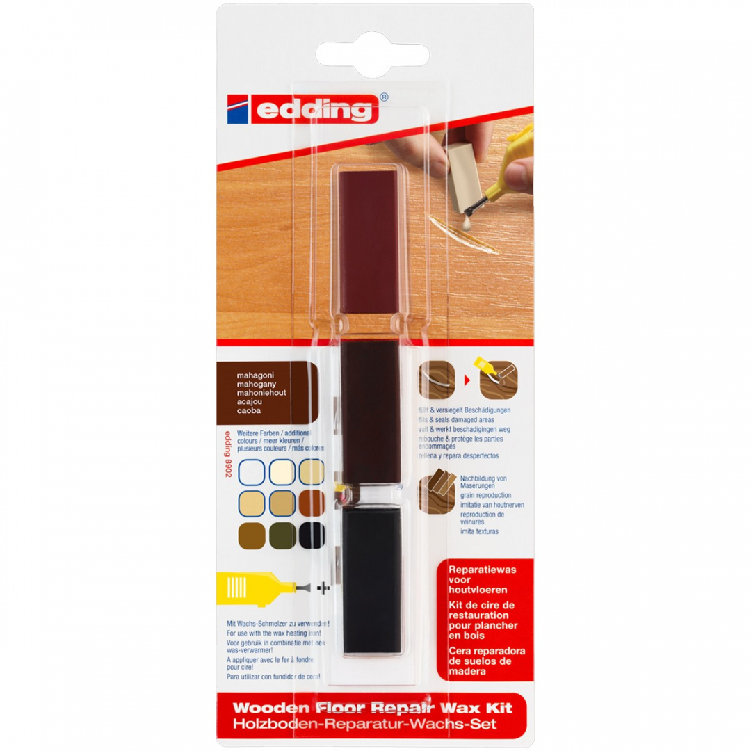 Воск для реставрации мебели Edding "8901", "8902" применяется для ремонта глубоких повреждений на деревянных, мебельных поверхностях. Мебельный воск идеален для ремонта повреждений на деревянных, мебельных поверхностях. Применяются как на горизонтальной так и на вертикальной поверхности. Смешивание различных цветов восковых мелков позволяет создать однородную текстуру с поверхностью. В комплект мебельного воска входит пластмассовый шпатель, которым очень удобно распределять воск по поврежденной поверхности. Мебельный воск доступен в 10 разных цветовых комплектах, 3 цвета в упаковке. Смесь из минеральных восков, окрашенных натуральным красящим пигментом. Очень просто использовать. Цвета можно смешать. Размер воскового бруска 40,0 +/-2,0 x 14,0 x 17,0 мм. Размягчаятся при 66° C, при 74° C полное размягчение продукта
