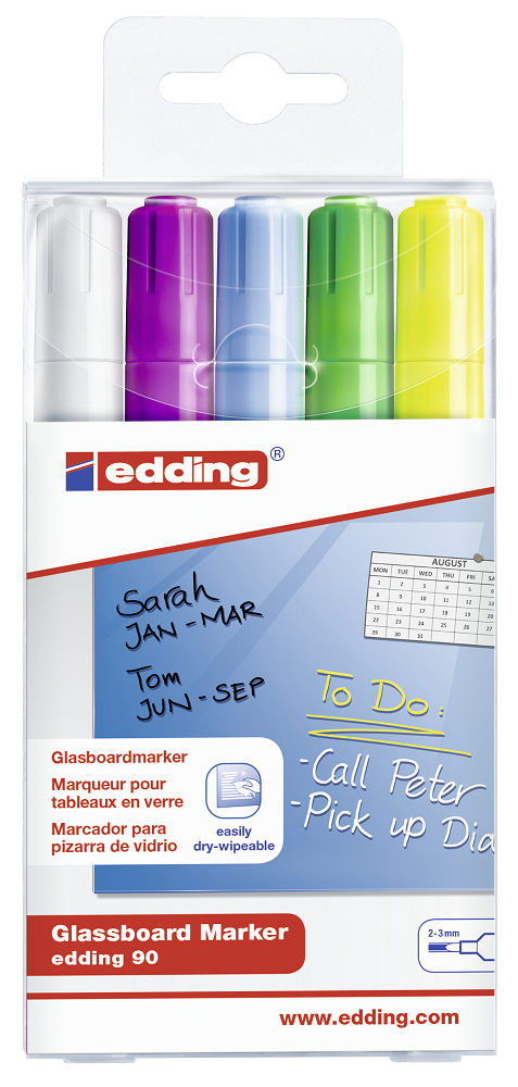 Маркеры для стеклянных досок серии "90" от немецкого производителя EDDING. Маркеры с конусообразным(круглым) наконечником, в пластиковом корпусе. Толщина линии: 2-3 мм. Подходит для всех окрашенных стеклянных досок и большинства стеклянных поверхностей. Блестящие светостойкие чернила ложатся плотным слоем. Легко удалить сухим способом даже спустя несколько недель. С системой подкачки чернил.